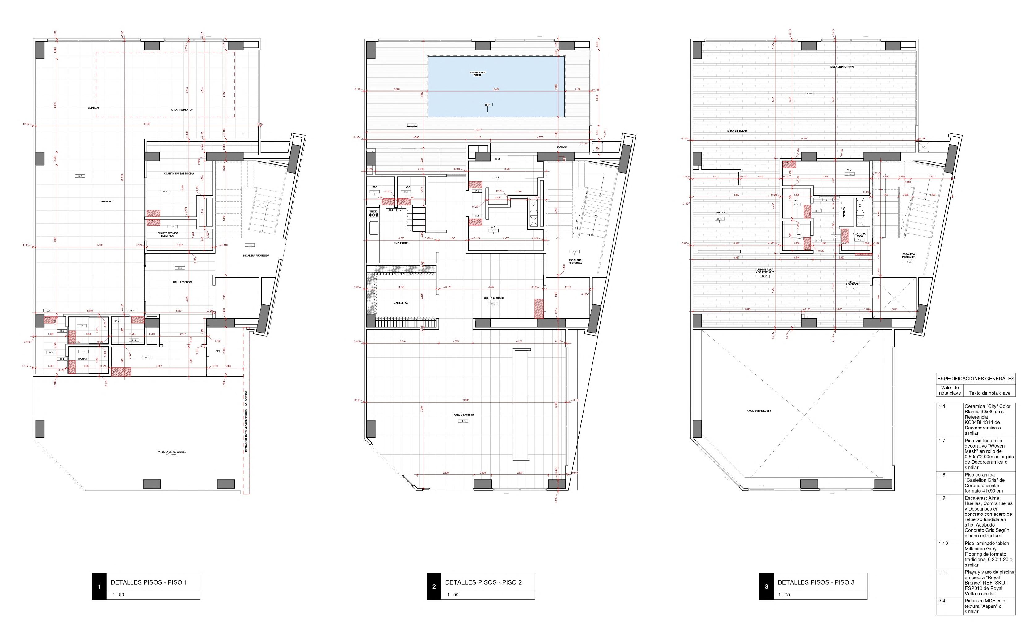 Entrando al nivel de detalles se realizaron diversos planos teniendo siempre en mente que se vea estructurado, detallado y entendible para el lector. Se realizaron detalles de suelos, escaleras, puertas, baños, cocineta, casilleros, recepción, cuarto de basuras y portería. Se realizo también un análisis y detalles de fachadas general para saber el área total en cada lado del proyecto. Cada detalle contiene una planta, alzado(s), corte(s) y en algunos casos detalles constructivos para entender mejor el funcionamiento del elemento.