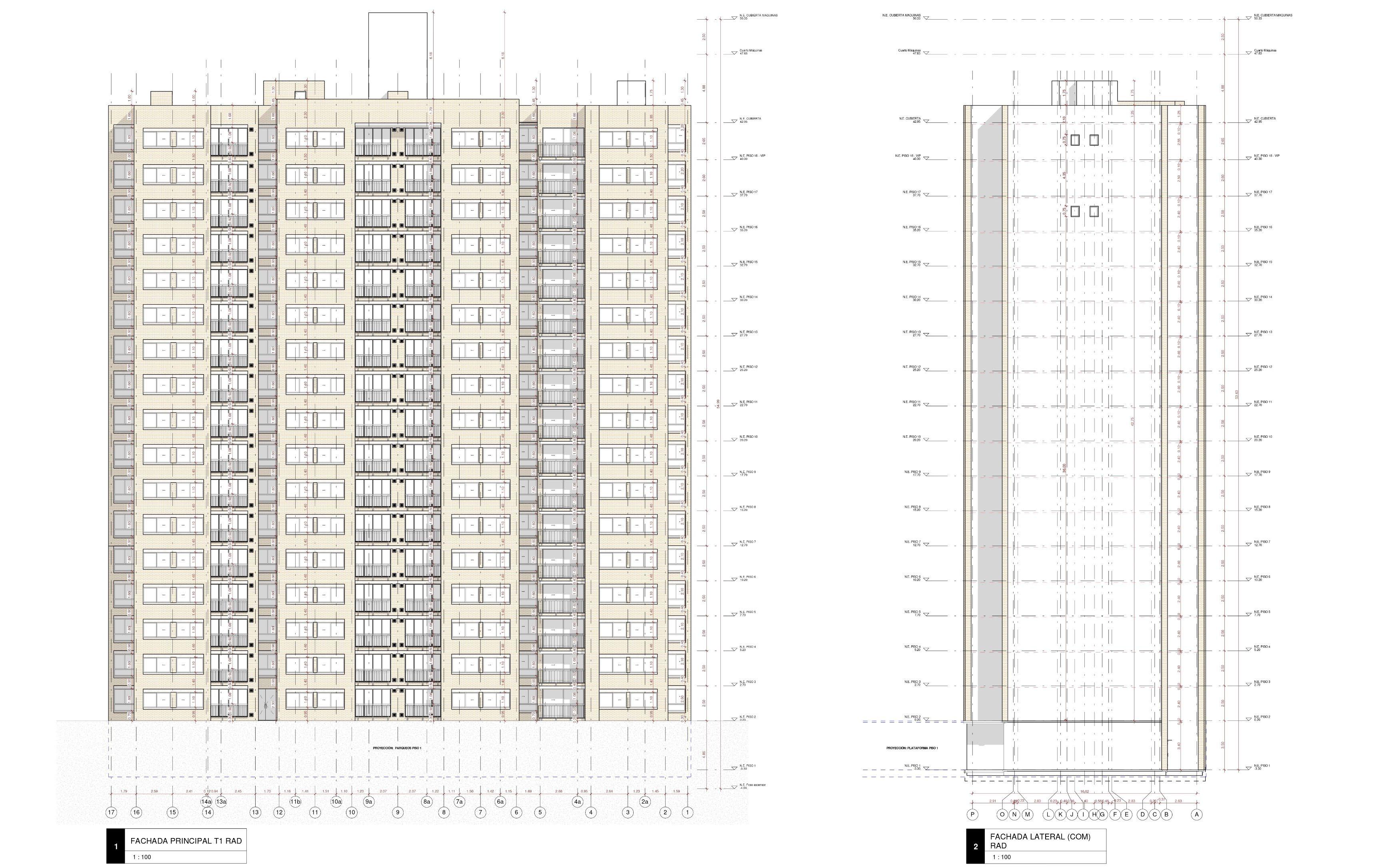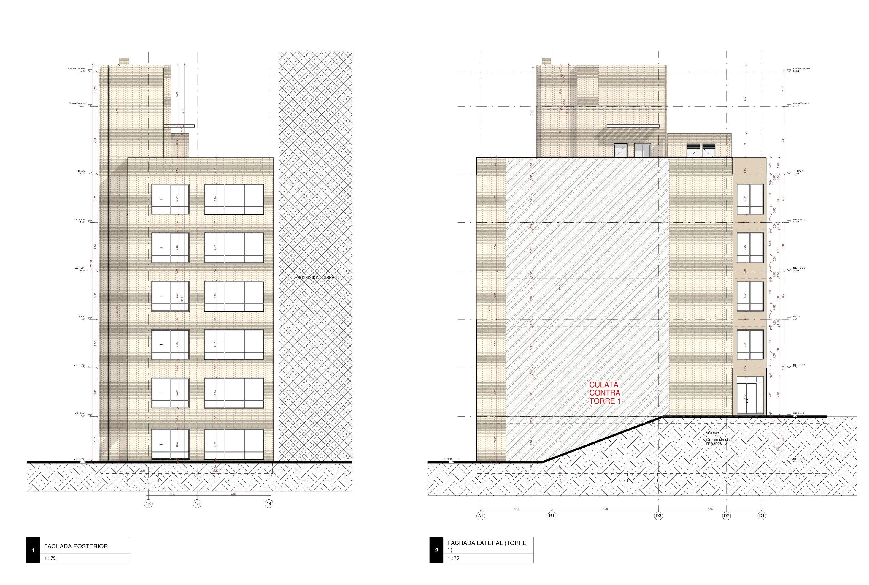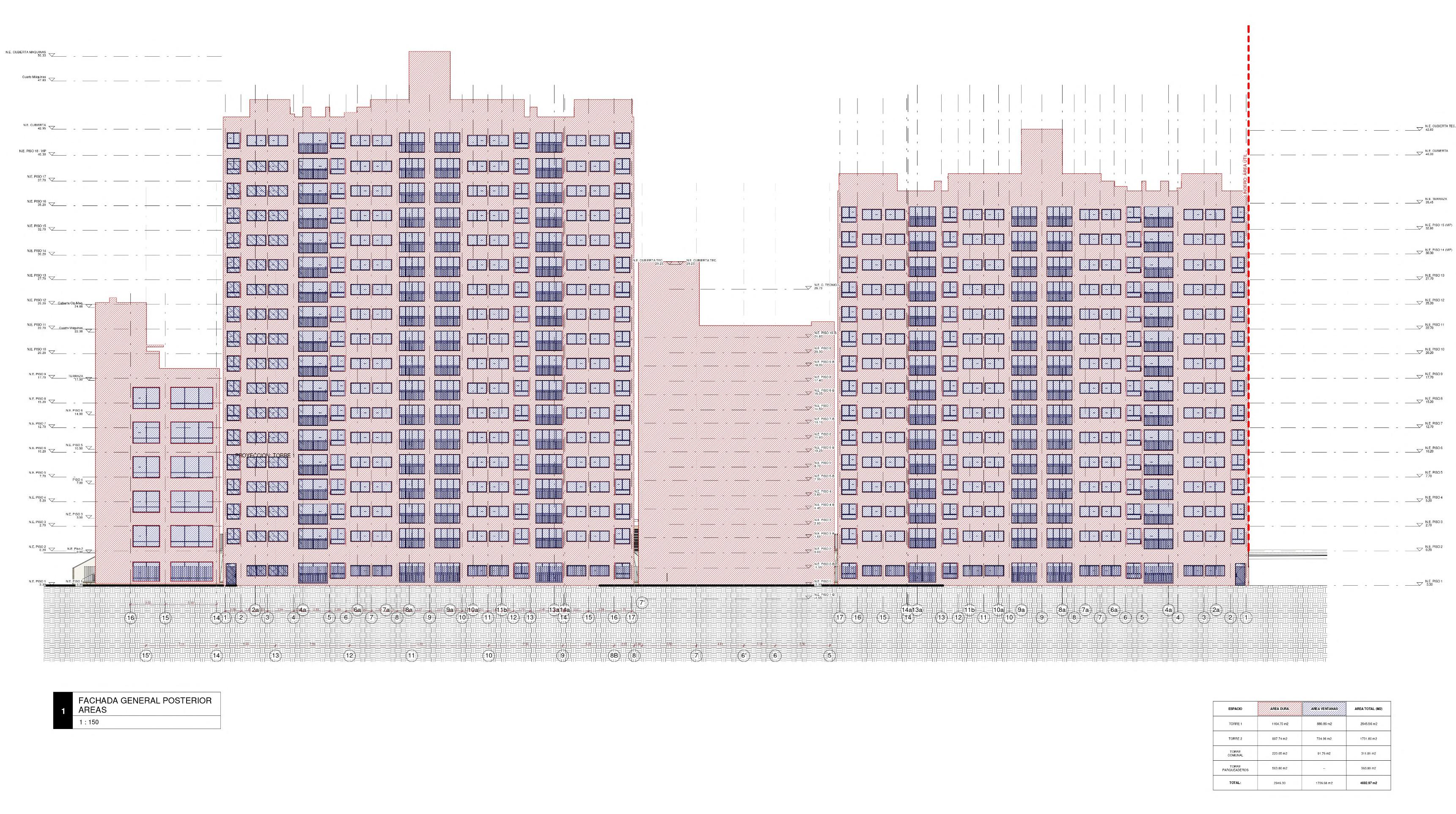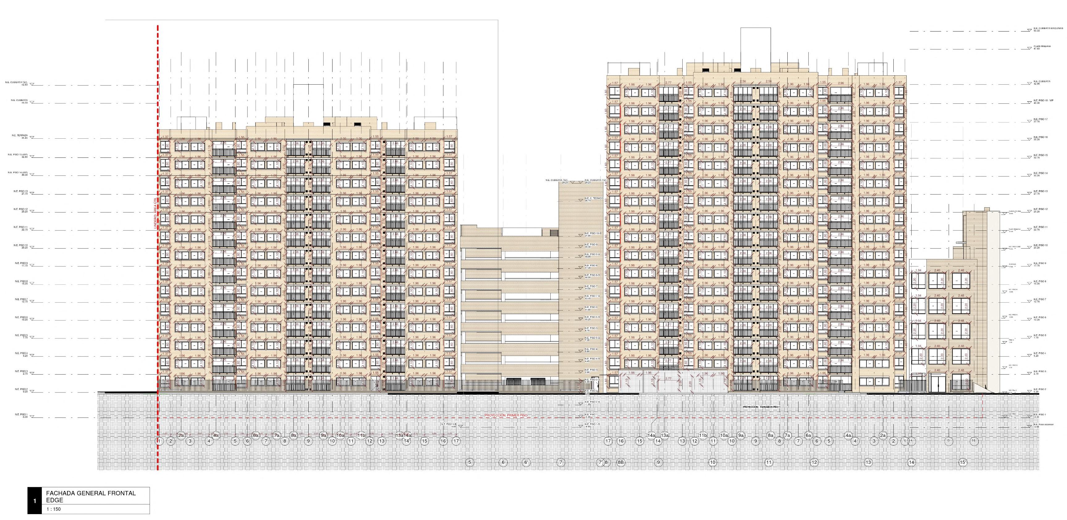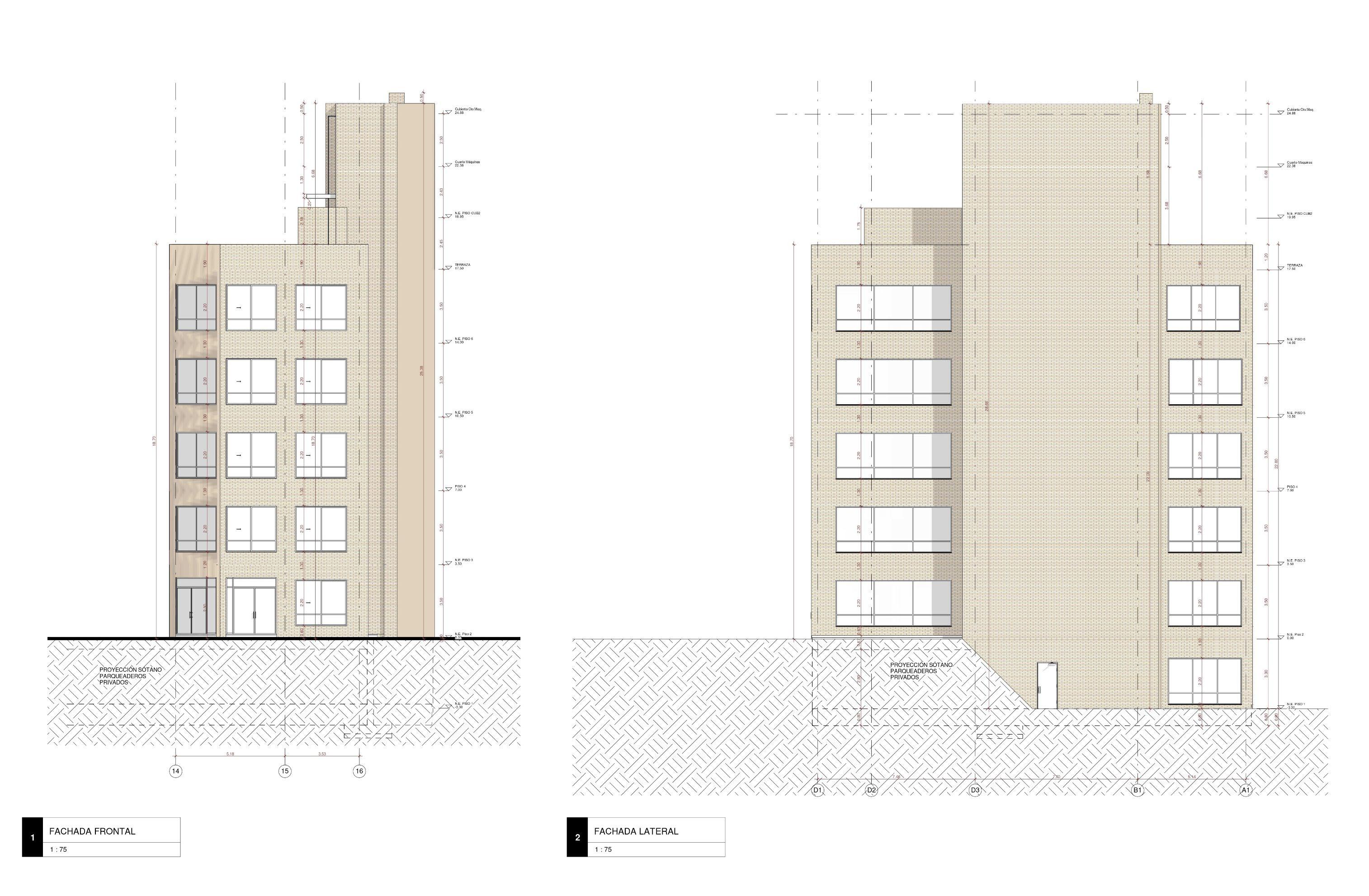 EL TRABAJO REALIZADO PARA LAS FACHADAS DE LA TORRE COMUNAL FUE LA REPRESENTACION Y APLICACIÓN DE EJES, COTAS DE ALTURA CON SUS RESPECTIVAS COTAS DE MEDICION DE CADA ALTURA Y LINEAS DE PROYECCION PARA REPRESENTAR NIVELES DE SOTANO APLIQUE DE TEXTURA