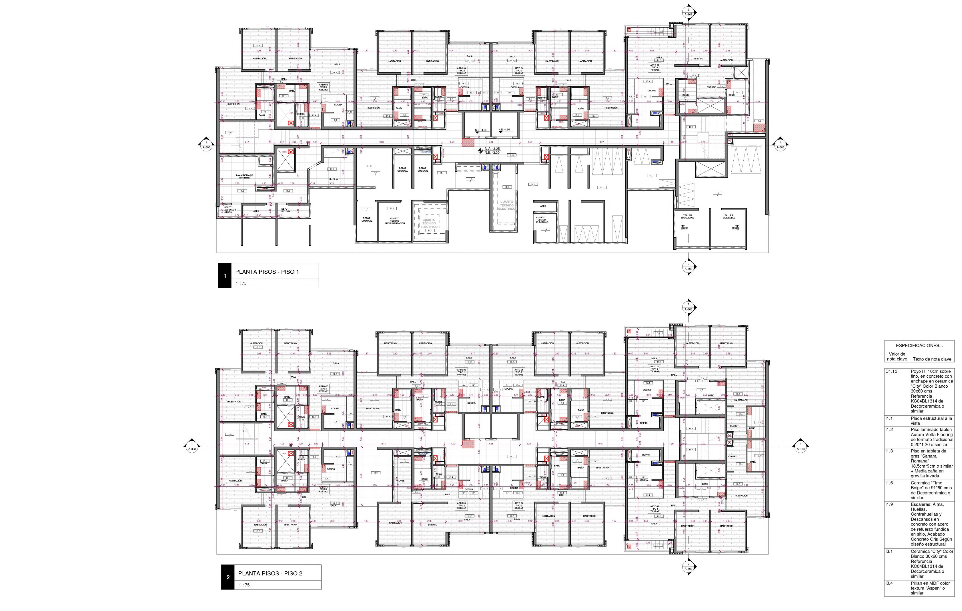 A partir del segundo corte se continua con los detalles de torre 1 que constan de puertas, ventanas, closets, suelos, cielos rasos y escaleras. Para el trabajo de puertas se realizo un conteo de puertas tipo en cada planta. Luego se realizo un cuadro de especificación en donde se agrega el código de cada puerta tipo la cantidad de cada puerta, sus dimensiones, direcciones de apertura y especificación general y referencias. El plano se organiza de tal manera que muestre el cuadro de especificaciones y vistas de cada tipo de puerta (planta, alzado y corte). El trabajo de ventanas al igual que las puertas fue realizar un conteo y análisis de cada tipo para su respectiva especificación y desarrollo de detalles en distintas vistas.