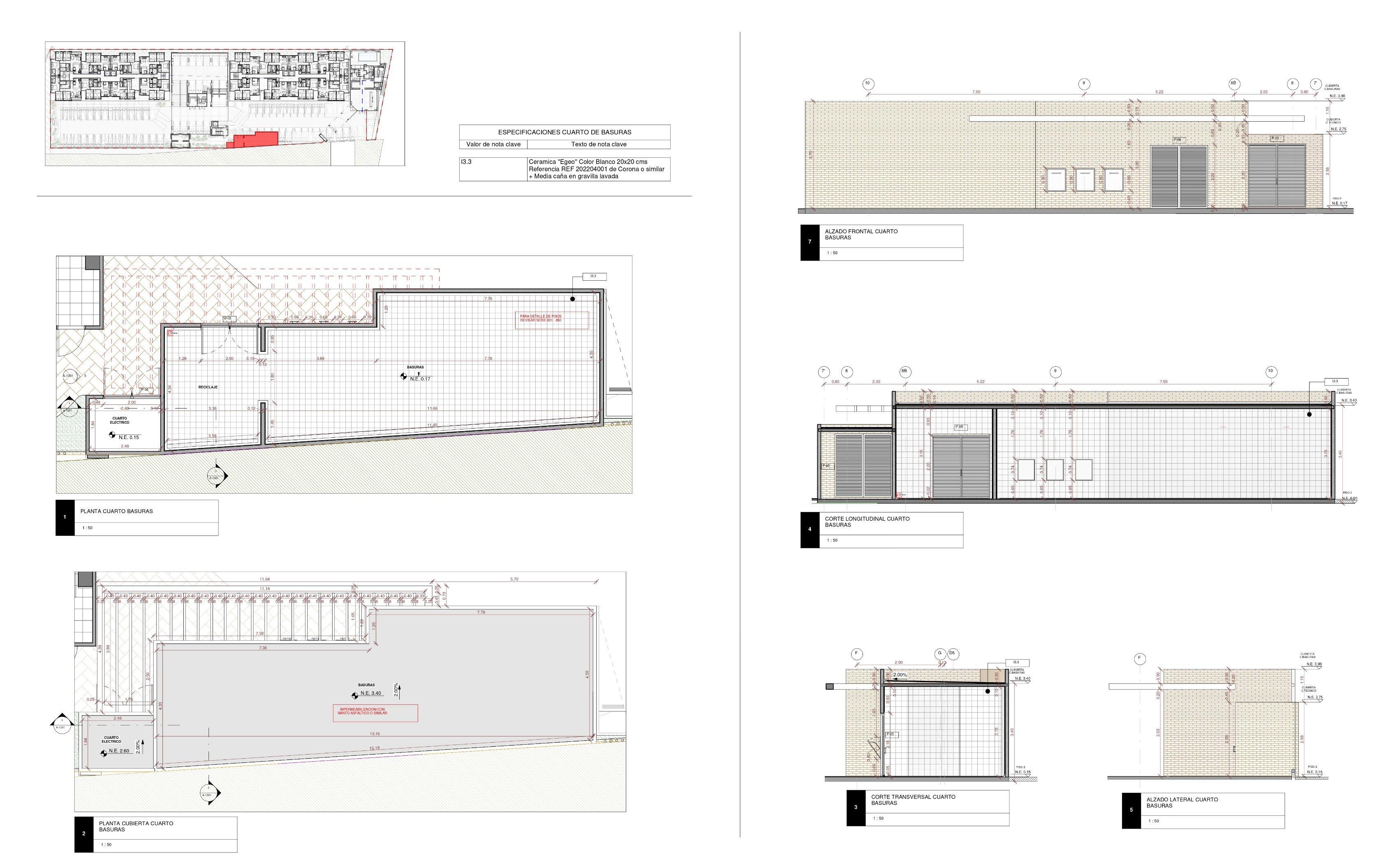 EL TRABAJO REALIZADO EN EL PLANO DE DETALLE DEL CUARTO DE BASURAS FUE LA ASIGNACION DE INFORMACION PERTINENTE PARA LA CONSTRUCCION DE ESTE ELEMENTO EL PLANO COMIENZA CON UNA PLANTA DE LOCALIZACION QUE ME PERMITE UBICAR EL ELEMENTO EN EL PROYECTO. SE MUESTRA UN PLANO DE PLANTA Y UNO DE CUBIERTA QUE PERMITE ANALIZAR TEMAS COMO ACOTADO. ALTURAS. MATERIALIDAD, ANOTACIONES Y PROYECCIONES. SE REALIZAN 3 VISTAS AL PROYECTO (2 ALZADOS Y UN CORTE) QUE INCLUYEN EJES, COTAS, GROSORES DE PLACA Y MATERIALIDAD