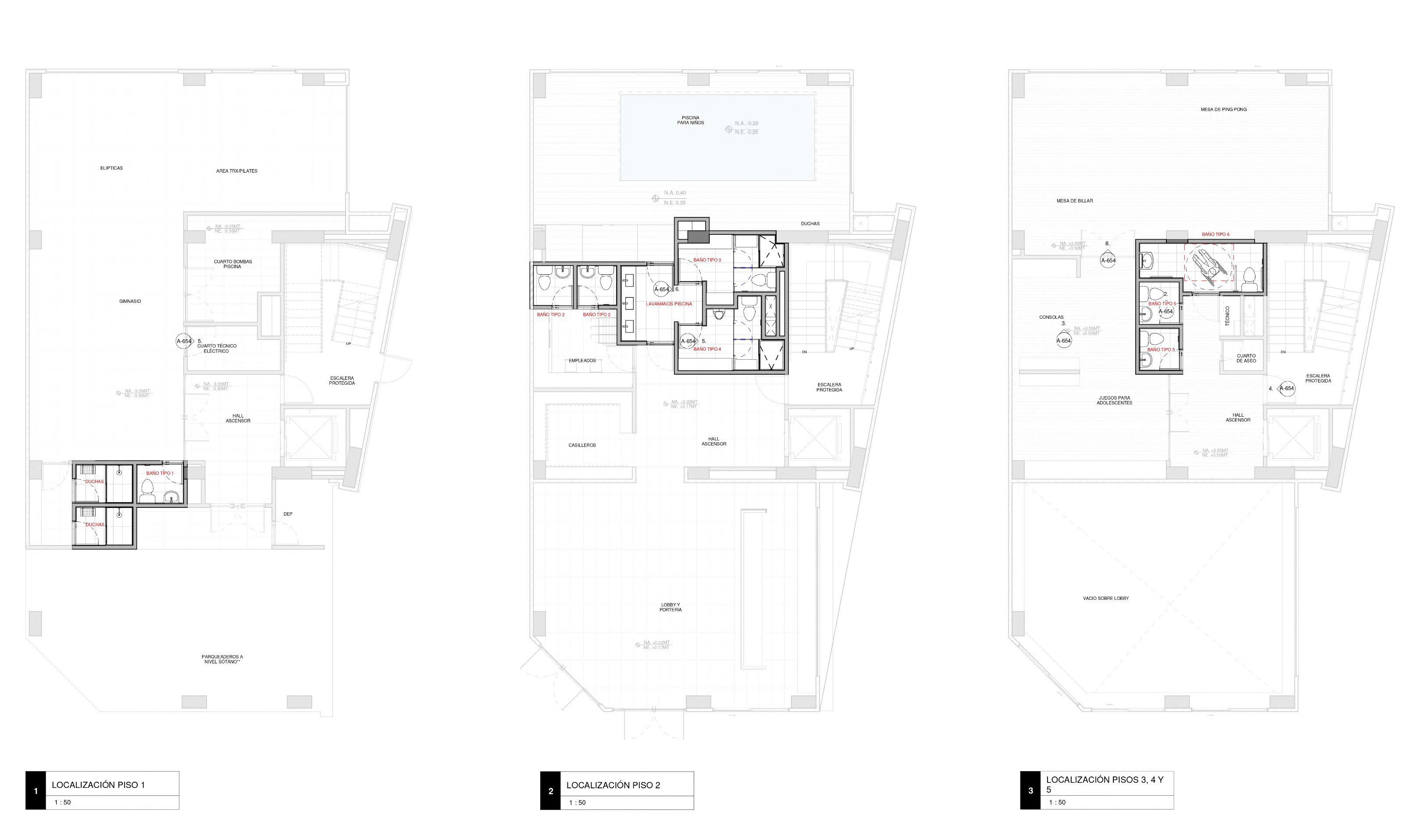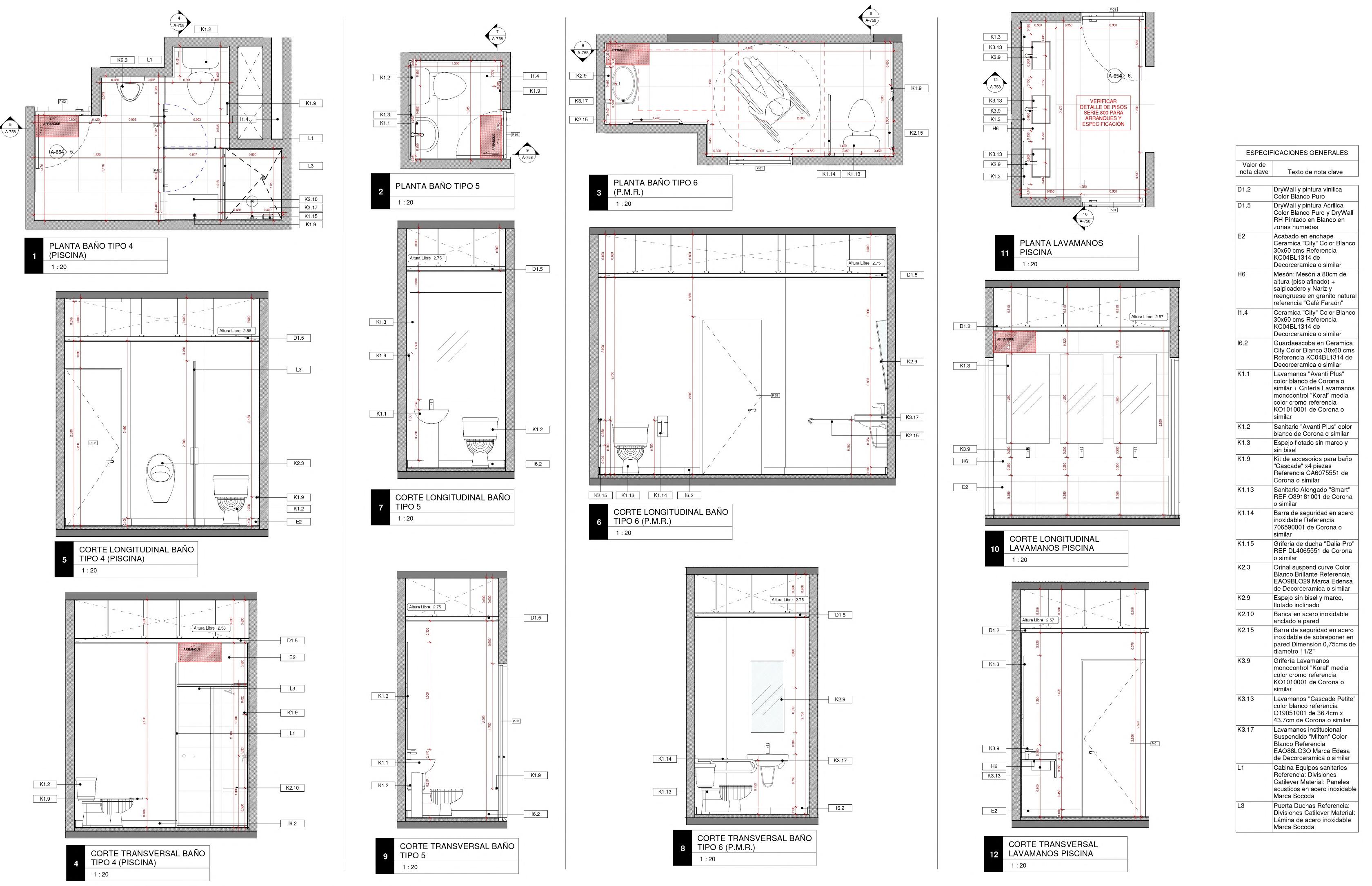 EL TRABAJO REALIZADO PARA EL DETALLE DE LOS BAÑOS COMUNALES COMIENZA CON LAS PLANTAS DE LOCALIZACION LAS CUALES INDICAN LA UBICACIÓN DE LOS BAÑOS QUE VARIAN SEGÚN SU USO (PISCINA, SERVICIOS, HALL) EN LOS DETALLES ESPECIFICOS DE CADA BAÑO SE REALIZO LA APLICACION DE MOBILIARIO CON ESPECIFICACION Y REPRESENTACION. TAMBIEN SE AGREGAN COTAS DE ALTURAS Y ANCHOS EN PLANTAS, CORTES Y ALZADOS. ADEMAS DE INDICADORES DE ARRANQUE Y ANOTATIVOS A TENER EN CUENTA.
