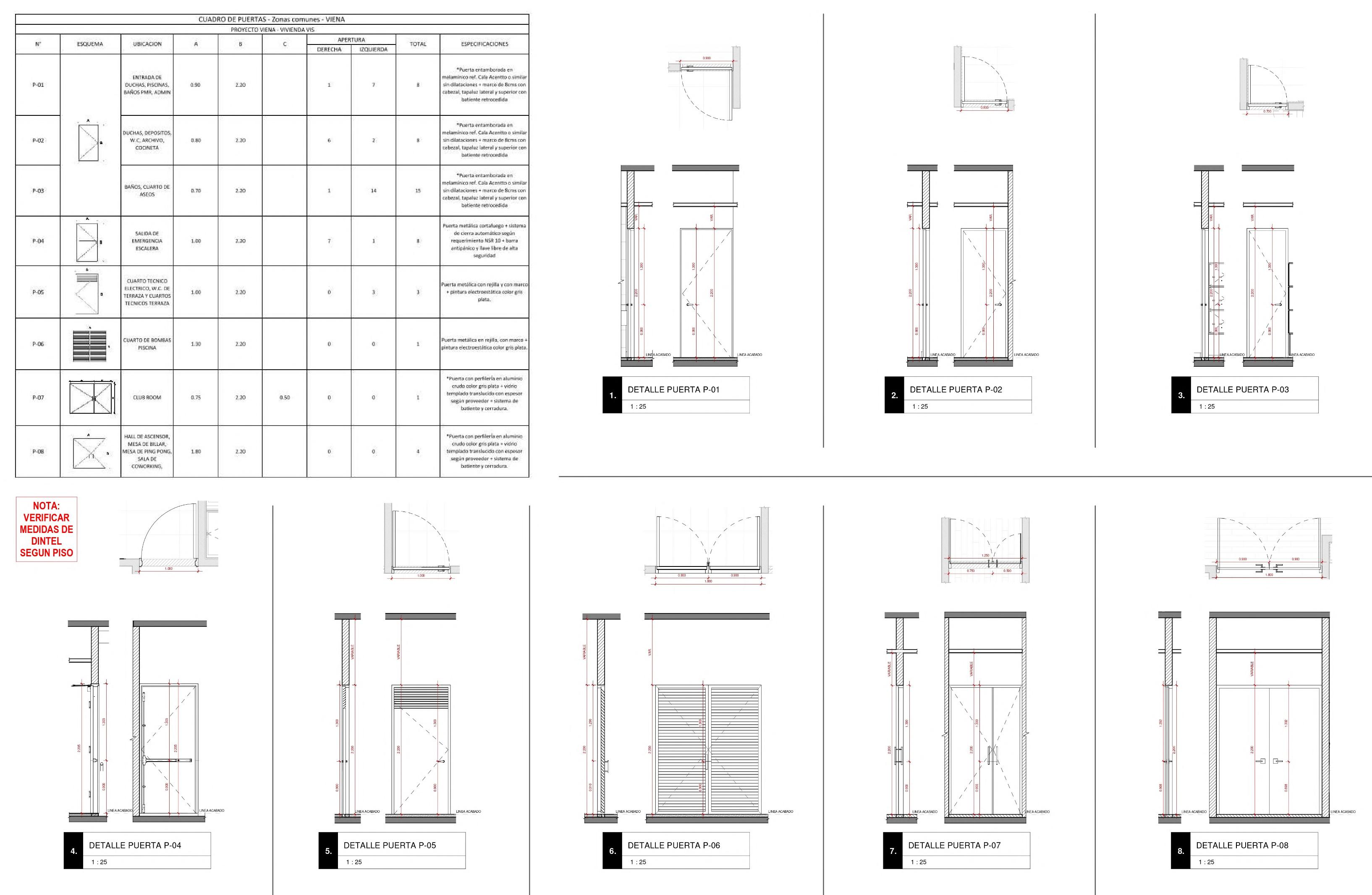 EL TRABAJO REALIZADO PARA LOS DETALLES DE LAS PUERTAS FUE EL CONTEO E INVENTARIO DE ESTAS. LA ASIGNACION DE COTAS Y VARIACION DE DIMENSIONES DE CADA UNA ASI COMO SUS PROYECCIONES DE ABERURAS SEGÚN SU USO. POR ULTIMO SE REALIZO LA ASIGNACION DE CODIGOS EN CADA PLANTA TIPO PARA TENER LA REFERENCIA Y UBICACIÓN DE CADA UNA.