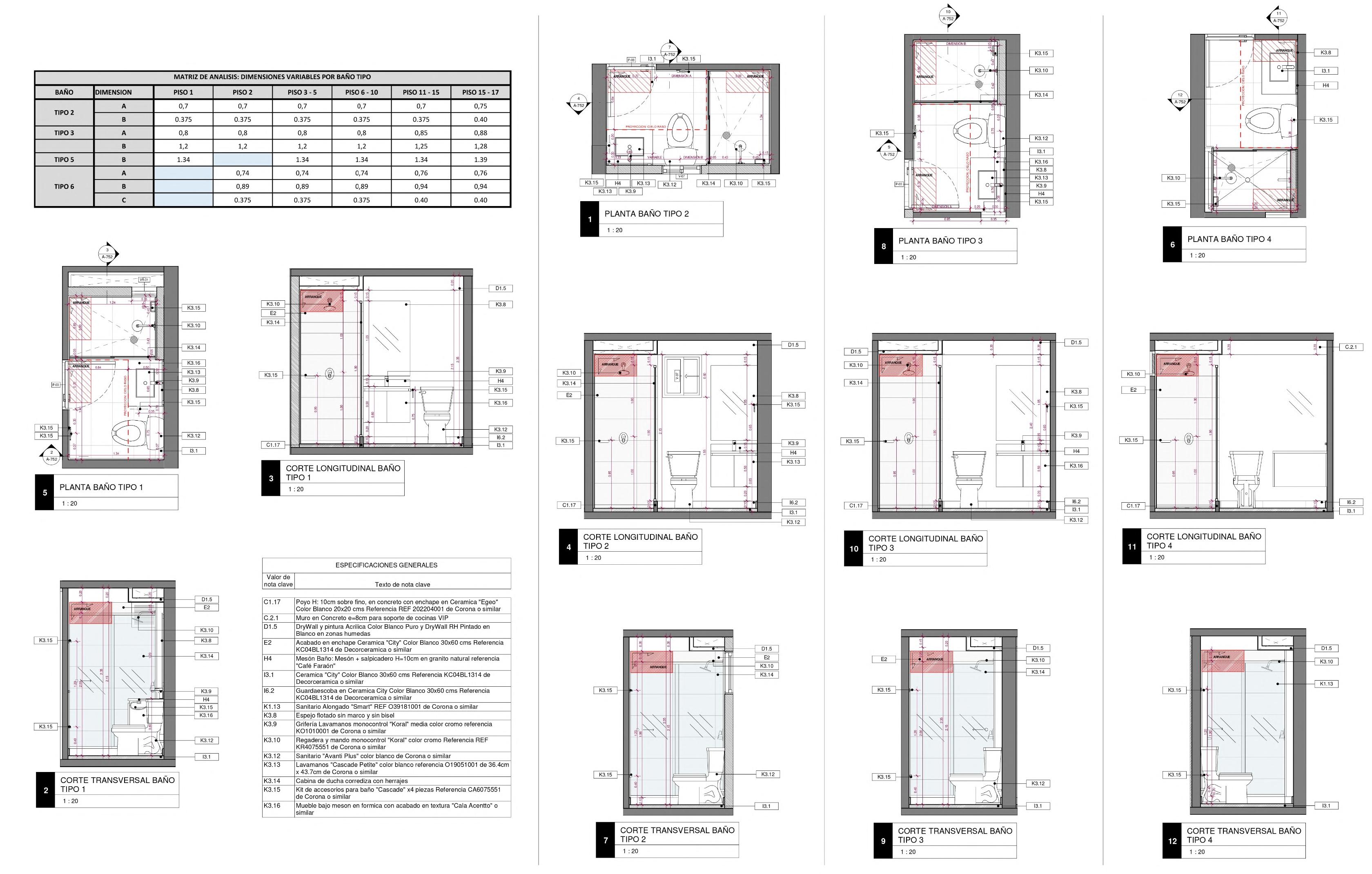 Cada detalle a realizar abordaba diferentes formas de expresión. Para los baños por ejemplo se debía indicar temas como especificaciones de cada mobiliario… el lavamanos, sanitario, accesorios (espejos, llaves, percheros), enchapes, material para cielo raso…etc. Debía anotarse la referencia y en algunos casos las dimensiones. Además de diferentes vistas del espacio como plantas, cortes y alzados. Cada una con su respectivo trabajo de acotado, indicadores, proyecciones, alturas…etc.