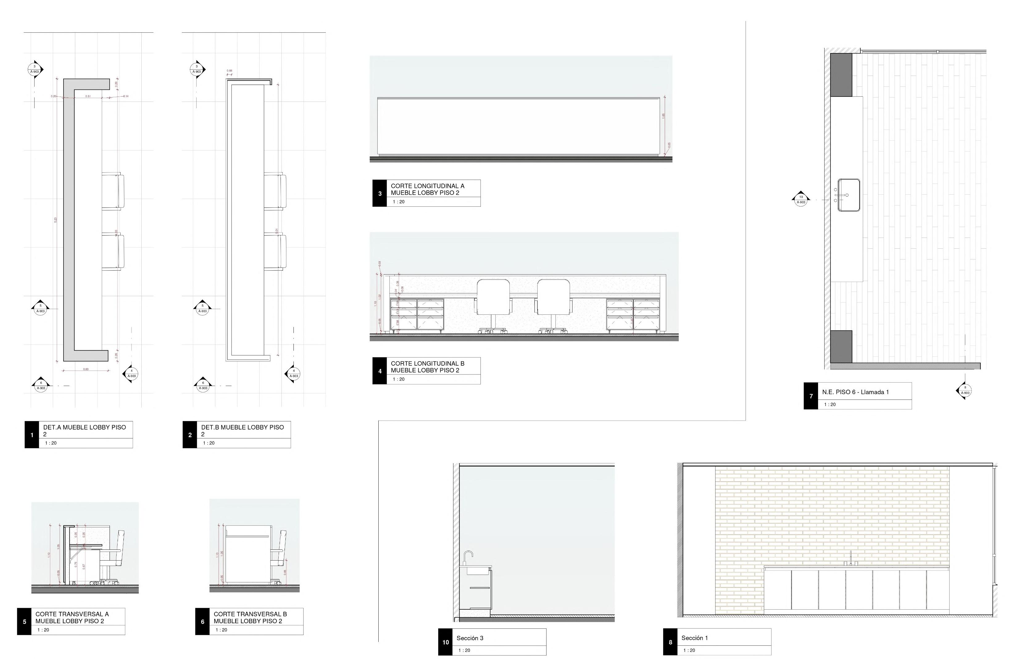 EL TRABAJO REALIZADO PARA LOS PLANOS DE DETALLES DE ESCRITORIO LOBBY FUE LA CREACION DEL MUEBLE DE RECEPCION CON SU RESPECTIVA ESPECIFICACION Y MOBILIARIO PERTINENTE. SE ASIGNA LA METIALIDAD Y SE MUESTRAN DISTINTAS VISTTAS DE LA MISMA. PARA EL DETALLE DE LA COCINETA SE ASIGNA EL MOBILIARIO ADAPTADO EN EL ESPACIO CON SUS RESPECTIVOS ESPACIOS DE ALMACENAMIENTO SUPERIOR E INFERIOR.