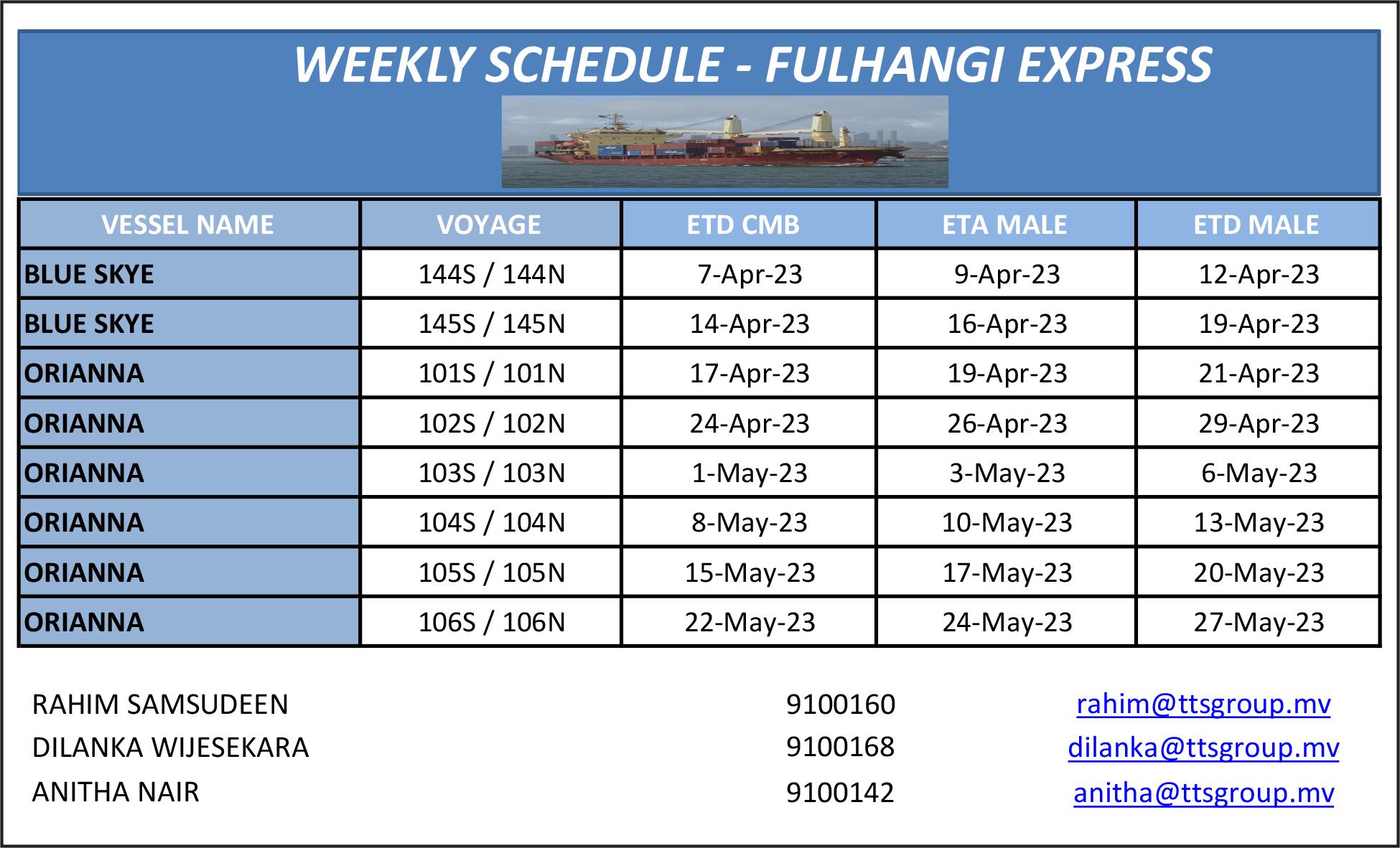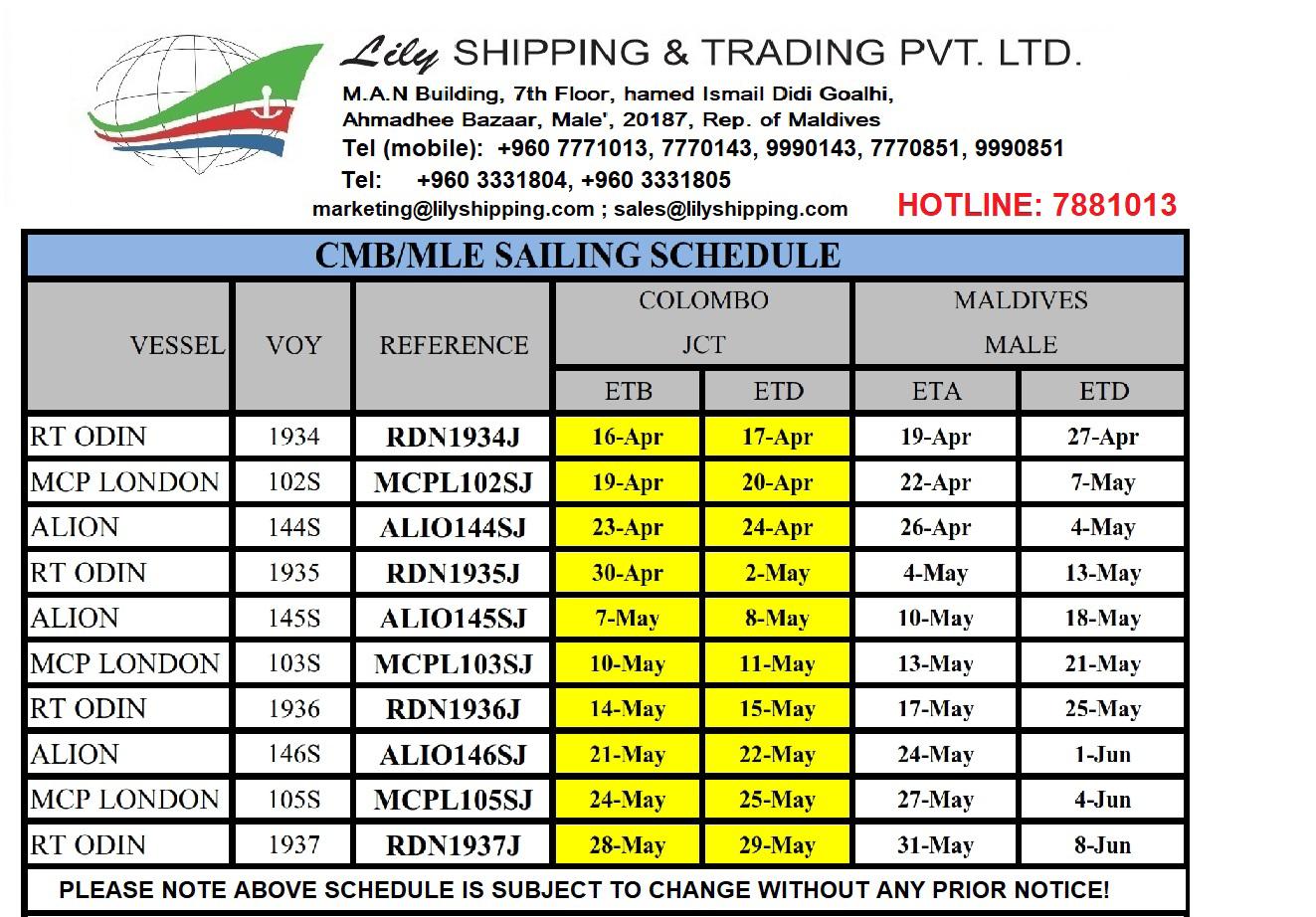 2023 ްލިރްޕޭއ 06 06 April 2023 t21 mihaaru.com 2019 ްލީރްޕެއ 23 23 April 2019 mihaaru.com 2019 ްލީރްޕެއ 23 TOTAL TRANSPORT SOLUTIONS MALDIVES (PVT) LTD 5th Floor, Ma. Bodudhaharaage,Chandhanee Magu, Male', Maldives T. +960 3011888, F. +960 3011999 VESSEL NAMEVOYETA SingaporeETA Tanjug PelepasETA Port KelangETA Colombo ETA Male' CALICANTO BRIDGE 04G35W1MA14-Apr-19 16-Apr-19 17-Apr-19 22-Apr-19 24-Apr-19 HEDDA SCHULTE 04G37W1MA20-Apr-19 21-Apr-19 23-Apr-19 28-Apr-19 30-Apr-19 CITY OF BEIJING 04G39W1MA27-Apr-19 28-Apr-19 30-Apr-19 5-May-19Feeder - 09/05/2019 AS CHRISTIANA 04G3BW1MA4-May-19 6-May-19 7-May-19 12-May-1914-May-19 EM ASTORIA 04G3DW1MA11-May-19 13-May-19 15-May-19 20-May-1922-May-19 Hattaya LOHNUB (Commercial Department) Shireen LEE (CustomerCare Department) Suzzana SANI (Customer Service) Mohd Muhajir Ahmad (Customer Service) Tel: 662 - 3523282-6, Fax: 662-3438807 Hotline: +65-6499-1111 DID: +603 2299 2911, Fax: +603 2299 2886 D/L: 07-2913064 VOIP line: 8889 3282 VoIP 8669-1112 VoIP: 8601 2911 VOIP: 8670 3064 e-mail: thd.hlohnub@cma-cgm.com e-mail: sij.sgbooking@cma-cgm.com e-mail: kua.ssani@cma-cgm.com Email: psg.mahmad@cma-cgm.com CMA CGM MALAYSIA (Penang) Chua Hwa Keong * We have upgraded our direct service from Leam Chabang (Thailand) to Male' 12 days. Tel 604 291 6876 Fax: 604 2276 770 * We are now pleased to inform that the new upgraded service offer WEEKLY ARRIVAL of cargo into Male'. VOIP 8671 6876 * Further details please contact Sheyam +960 9100170 or Atif +960 9100175 Email: pen.hkchua@cma-cgm.com * DATE WILL SUBJECT TO CHANGE TOTAL TRANSPORT SOLUTIONS MALDIVES (PVT) LTD 5th Floor, Ma. Bodudhaharaage, Chandhanee Magu, Male', Maldives T. +960 3011888, F. +960 3011999