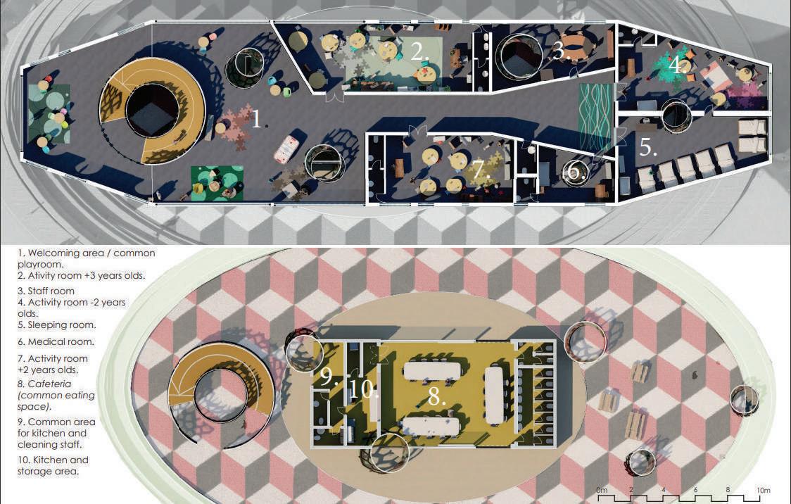 “One of the most important and joyful parts of your life should be your childhood, so why not make it the best for today’s children?” The design is heavily driven by the site’s history, a bastion from the second World War from “The Home of the Navy” situated next to the site. The fluent stacked boat shape reminds heritage and tradition and is a creativity booster for the youth.