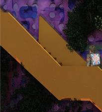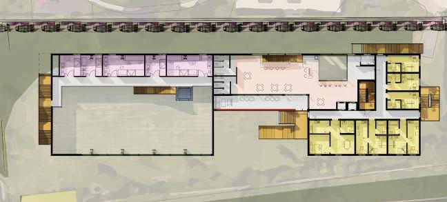 Two-storey buildings perforated by the metal frame* all under a green roof. The structure is situated a few meters under the ground level, so the oval staircase could achieve an atrium effect. The functions are separated by the levels. Food area on the ground floor, activities on the second and outdoor activities on the third.