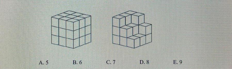 The large cube that Natalija made has 27 cubes and Diana only has 20 in her work, therefore she needs to add 7 more cubes (Answer:C.7).
