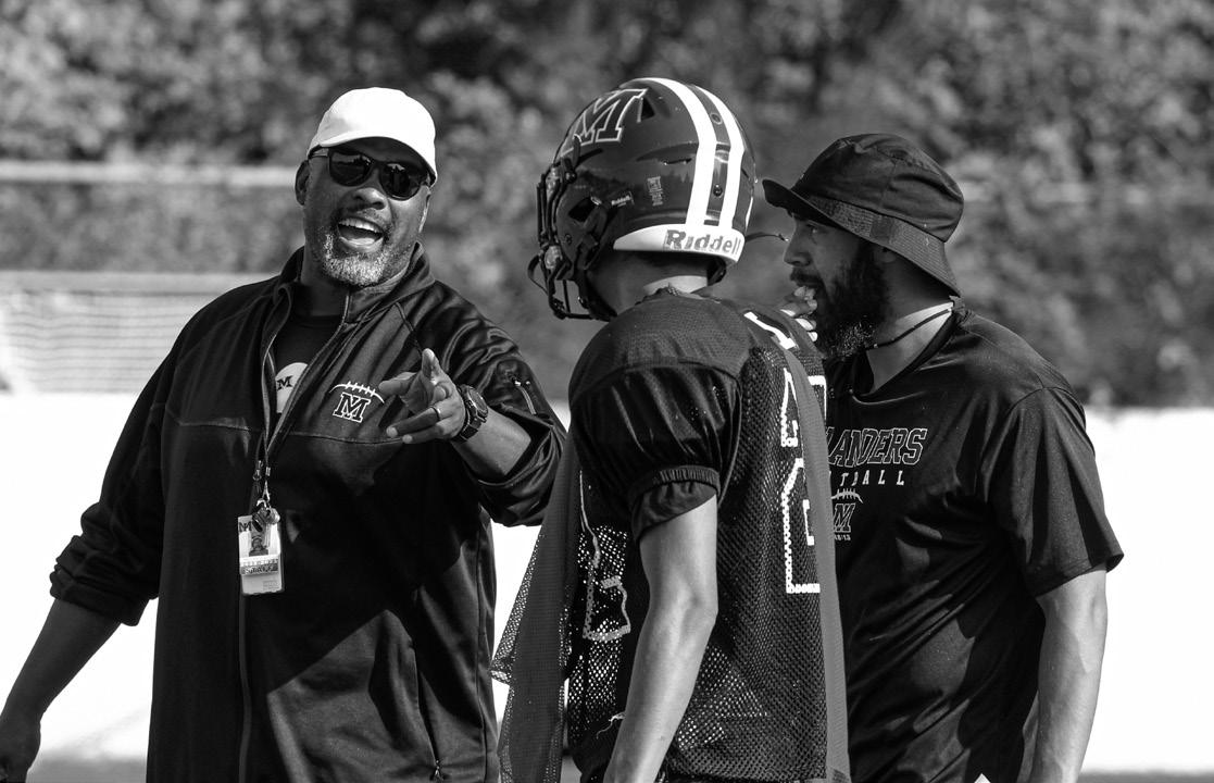 On a hot Tuesday afternoon, DJ Mims strides down the stairs in the stadium, extends a welcome (and an apology, presumably for the difficulty tracking him down), and takes a seat on the steel bleachers. The sun beats down on us and his football team, who run drills on the field ahead of us.