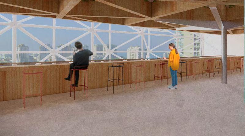 o mirante surge como solução para o desnível de 8 metros entre as ruas Santo Amaro e Abolição, conectando a parte alta e baixa do parque. Composto por paredões retos e lajes de formas orgânicas, torna-se um marco visual na paisagem, facilitando a circulação e oferecendo um novo ponto de observação do terreno e do patrimônio.