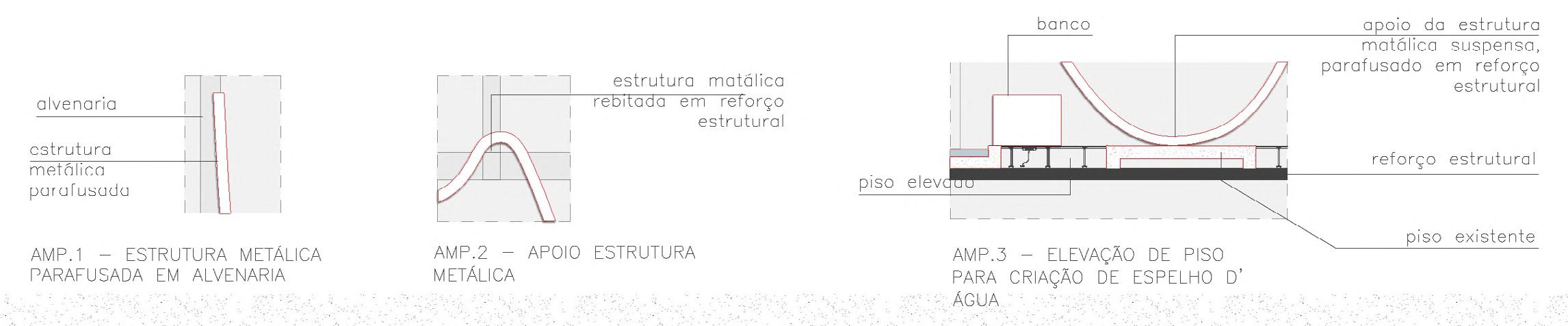'Rio das baias" nasce como um resgate a respeito dos córregos da bacia pirajussara que passam sob as duas grandes avenidas que rodeiam o parque. O projeto expografi co trabalha com o desenho da topografi a original da bacia, antes da ação humana, criando um relevo suspenso no espaço, pendurado na própria estrutura existente da cobertura das baias. Tirando partido disso, narra-se desde a nascente de um rio até a sua revolta (enchente) que, por fi m, se transporma em um espelho d´água, literalmente, rachando o chão sob nossos pés, como quem grita: “apesar de soterrado, ainda estou aqui”.