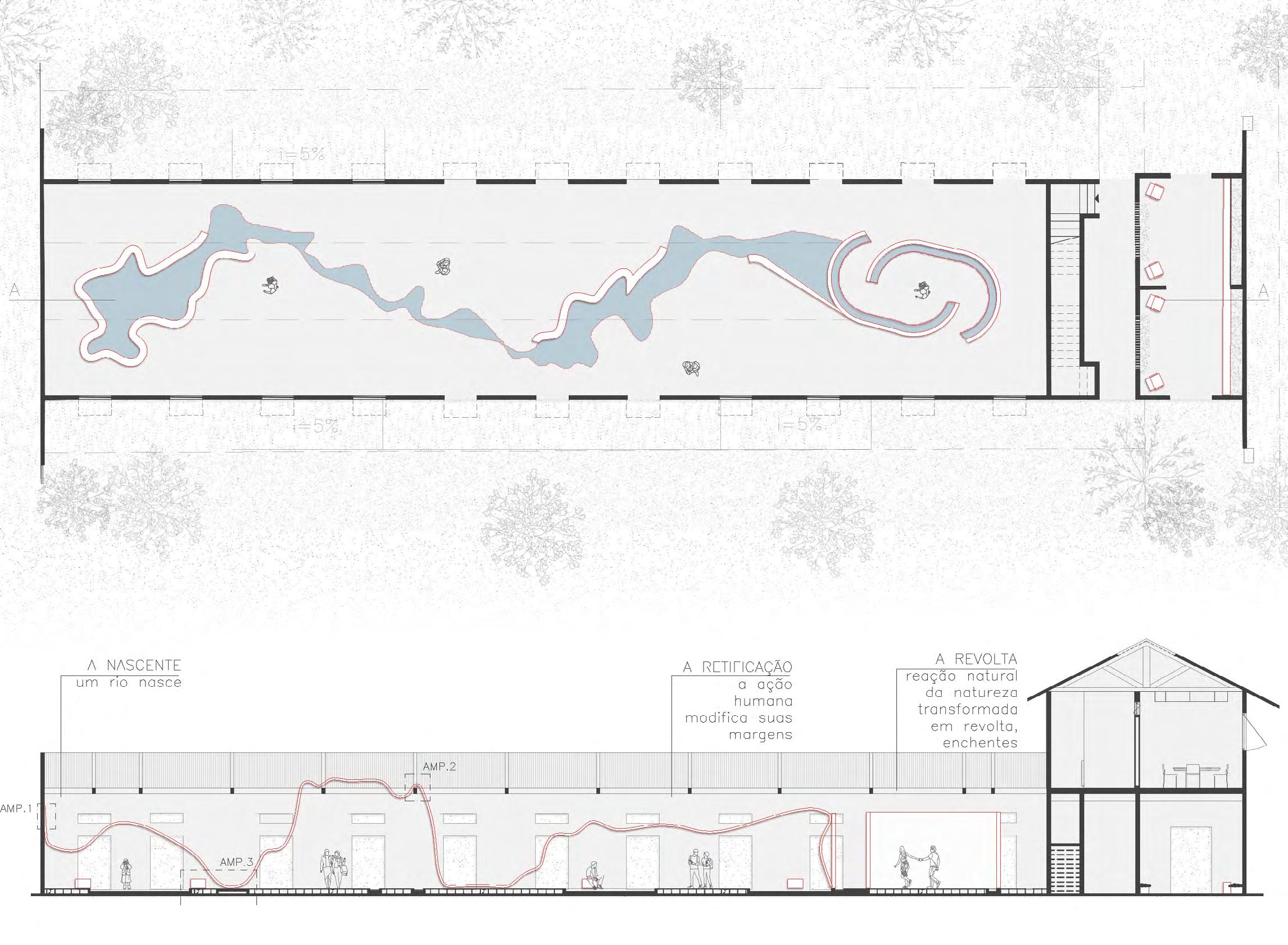 Entre os ambientes criados para o Polo Cultural, destaca-se a seguir, o projeto expográfico “O Rio das Baias”. Inspirado na história dos rios da cidade de São Paulo, esse espaço cenográfico ocupa uma das baias do conjunto — demarcada ao lado em vermelho — e propõe uma reflexão sensorial e poética sobre o apagamento e a redescoberta dos cursos d’água na paisagem urbana.