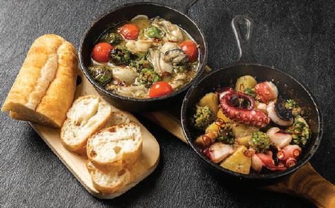 スペインといえばバル。昼はカフェ、夜は居酒屋としてワインを飲みなが 小皿料理( タパス)を堪能す 時間はスペイン滞在中の楽しみ。日本同様、国土の多くが海に接し てい こともあ 海鮮が豊富なのですが、ニンニクとオリーブオイルを多用す とこ がスペイン料理な ではです。タパスのひとつ、アヒージョはその代表格で、エビやムー ル貝、タコ、イカなどの具材をニンニクを入 たオリーブオイルで煮込んだもの。アヒ ージョはスペイン語で刻んだニンニクを意味す 言葉なので、厳密には「具材名+ア ヒージョ」と注文します。アヒージョは具材のおいしさはもち ん、具材の味がしみ込