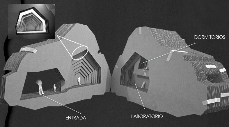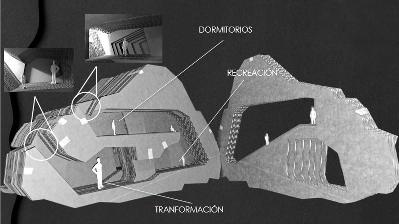• Este espacio es el nexo entre el espacio de transformación al interior de la montaña y el resto de espacios que se diseñaran para la escuela. Desde este espacio se accederá a las aulas de la escuela, es decir es el inicio de la secuencia espacial que deberán generar en esta nueva etapa del proyecto. La materialidad de este espacio se basará en las placas que seextiendendesdeelinterior de la montaña Deberán plantear que tipo de espacio generarán:unespaciovirtual, espacio abierto, espacio cerrado,etc..