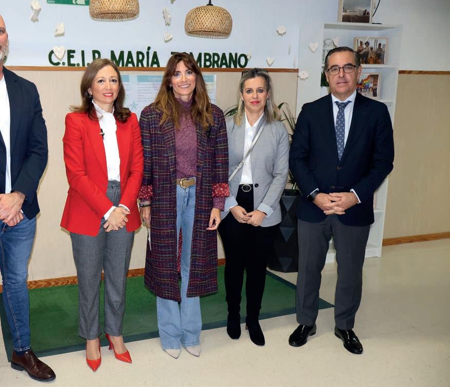La delegada del Gobierno andaluz en Málaga, Patricia Navarro (2ª izq.), dio a conocer el plan acompañada de la alcaldesa de Mijas, Ana Mata (centro); el delegado territorial de Educación, Miguel Briones (dcha.); y los directores de los colegios María Zambrano y Tamixa, Raúl Ávila y Rocío Oliva, respectivamente / Francisco M. Romero.