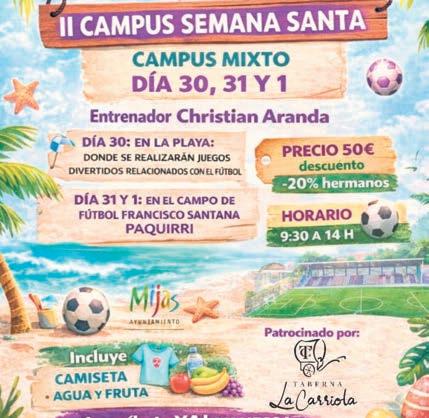 El Club Deportivo Torreón Cala Mijas vuelve a ofrecer una alternativa deportiva y divertida para la Semana Santa, lunes, martes y miércoles. Con un precio de 50 euros y descuento familiar, se desarrollará de 9:30 a 14 horas en la playa, el lunes 30, y en el campo Francisco Santana, el martes y el miércoles, con el entrenador Christian Aranda a la cabeza. Incluye camiseta, fruta y mucha diversión.