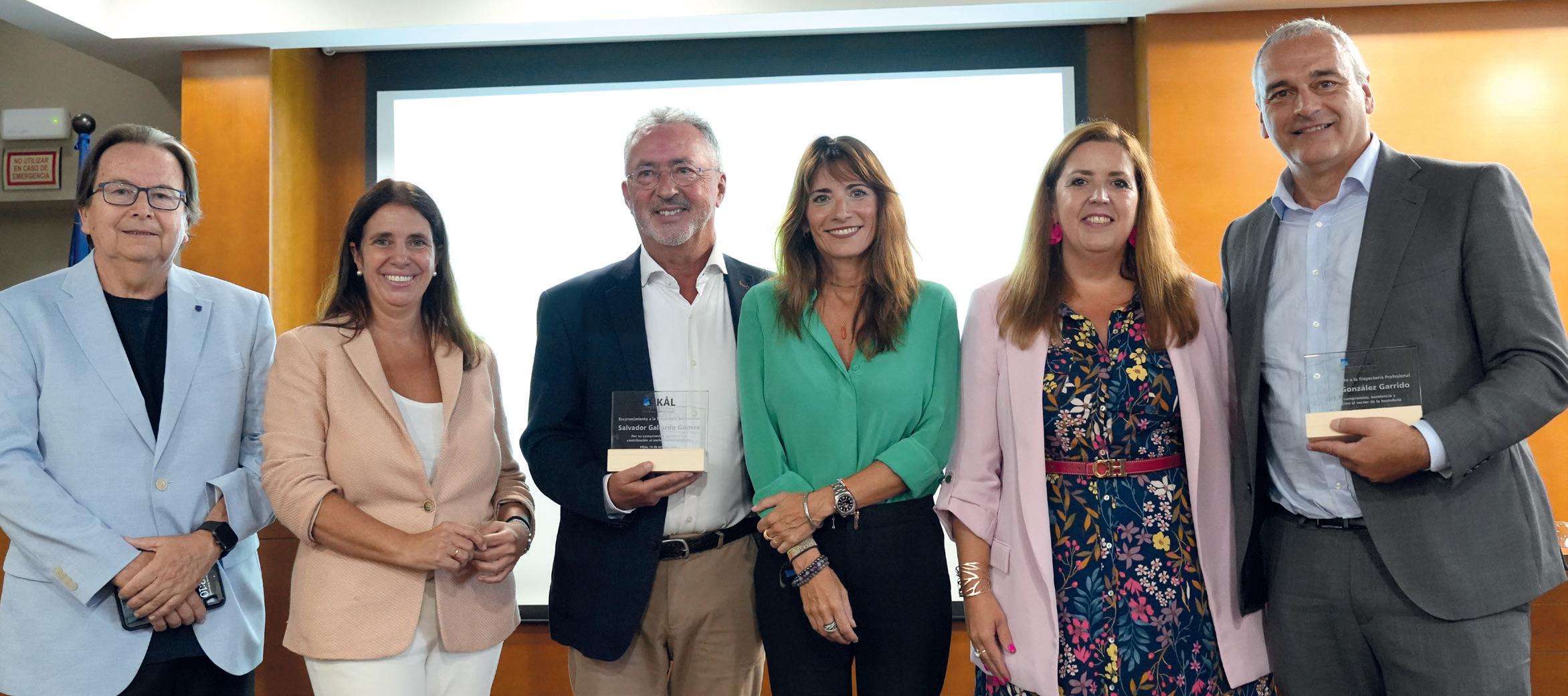 The mayoress of Mijas, Ana Mata (3rd right); the Managing Director of SAE, María Victoria Martín-Lomeña (2nd left); the director of CIOMijas, Raquel Hidalgo-Barquero; and the honorary president of Skäi, Andrés Arcos (1st left), with honourees Salvador Gallardo (3rd left) and Ángel González (1st right). / Carmen Martín.
