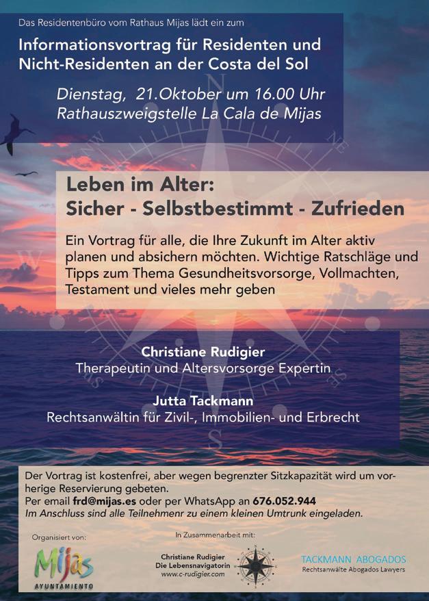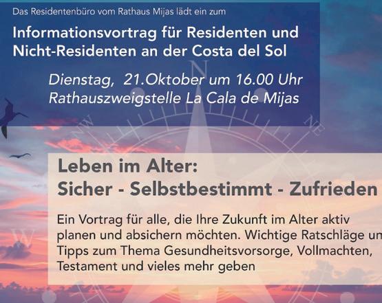 The next activity will be a talk in German on the 21st of October entitled ‘How to enjoy life in old age’, offering advice on planning for and enjoying retirement. This talk, explained department technician, Katja Thirion, is aimed at both German-speaking residents and non-residents. The talk will be given by Christiane Rudigier, a retirement planning exper, and Jutta Tackmann, a solicitor. Attendance is free, but registration is required via email at frd@mijas.es or WhatsApp at 676 052 944.