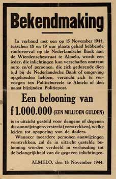 Het is woensdag 15 november 1944, iets na halfzes. Een koude, bewolkte herfstdag. In Almelo dringen vijf met pistolen en handgraten bewapende mannen de Nederlandsche Bank binnen. Bankdirecteur Smits, een NSB-er, wordt gedwongen de kluis te openen. Dertien kisten worden naar buiten gedragen gevuld met ruim 46 miljoen gulden, omgerekend naar nu bijna 300 miljoen Euro. Het is de grootste bankoverval aller tijden, er wordt meer buit gemaakt dan bij de beruchte Britse treinroof.