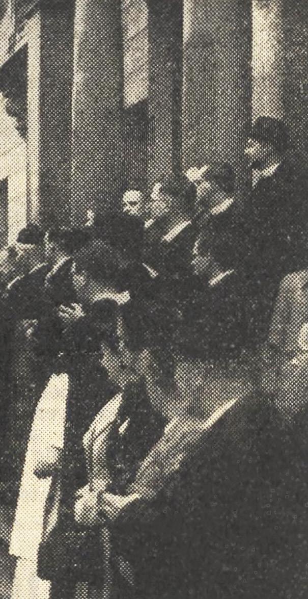 Het défilé, dat Zaterdagmiddag ter gelegenheid van de „Demitento’ gehouden werd. Op het bordes van het stadhuis slaan de autoriteiten het schouwspel gaande.’ (Deventer dagblad, 20 september 1950).