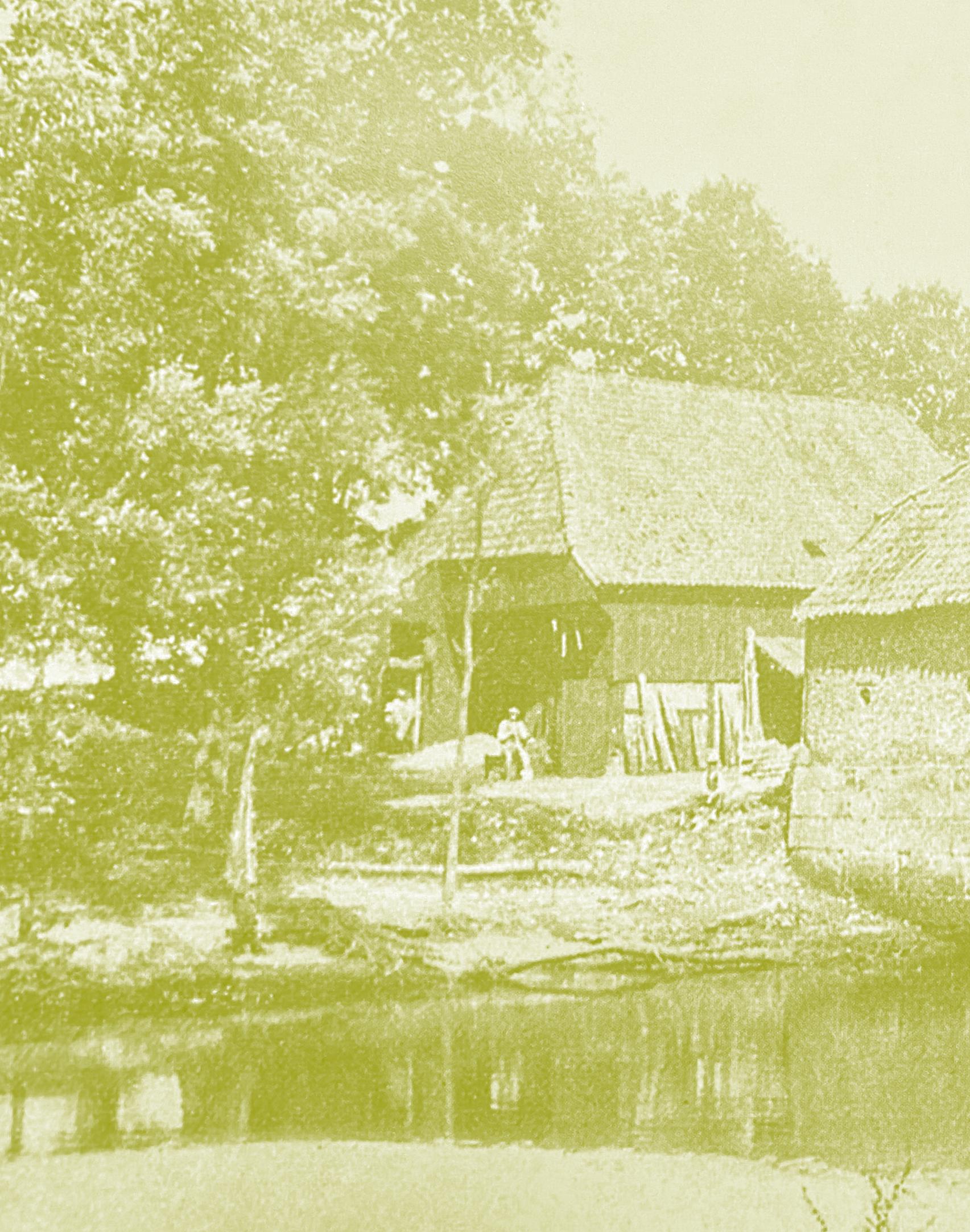 De molen in 1946, kort voor de oliemolen (rechts nog net zichtbaar) in de kolk verdween. Vanwege de planken op de achtergrond vermoed men dat er ook een zagerij was die door de molen werd aangedreven
