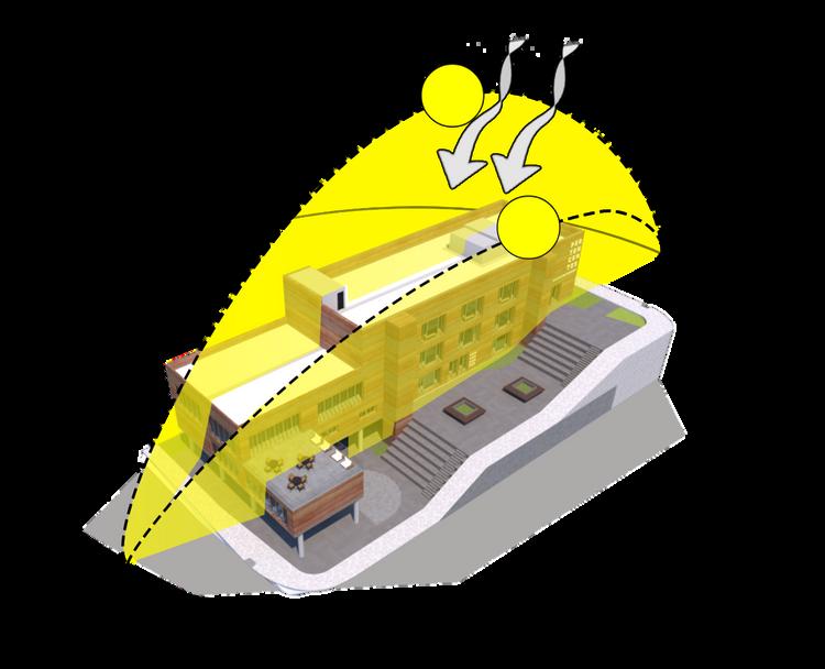 Para diminuir a temperatura dentro da edificação foi usado a Taipa de pilão nas paredes externas, que consegue absorver durante o dia o calor e manter o ambiente interno com temperatura amena enquanto a noite as paredes liberam o calor absorv