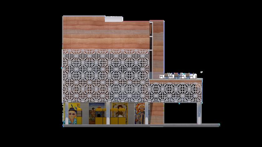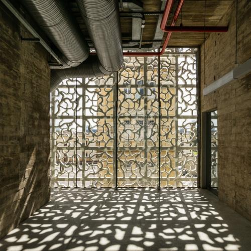 E para diminuição da insolação projetou se uma malha de cobogós com um desenho único inspirado na Flor de Malta do Chapéu de Cangaceiro, elemento nordestino importante, aplicado nas paredes laterais e fachada frontal. Os cobogós de concreto medem 1,05x1,05m e pintados na cor branca, causando contraste com a cor da Taipa.