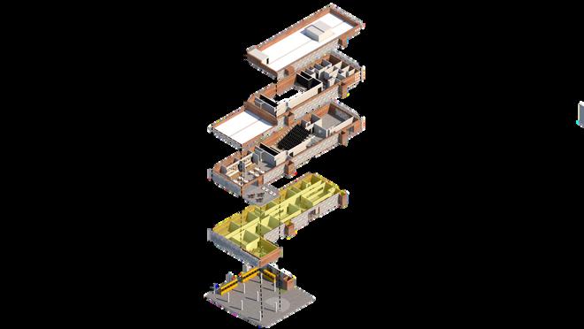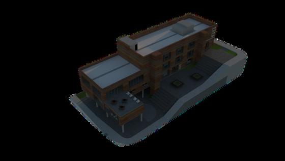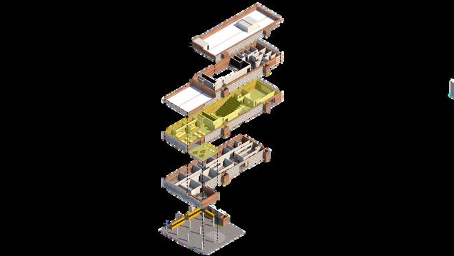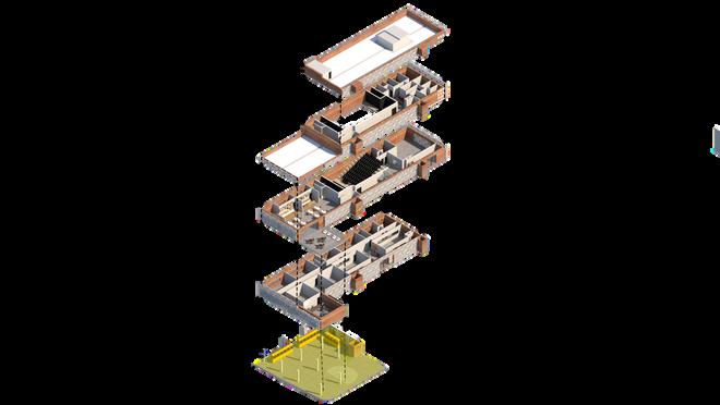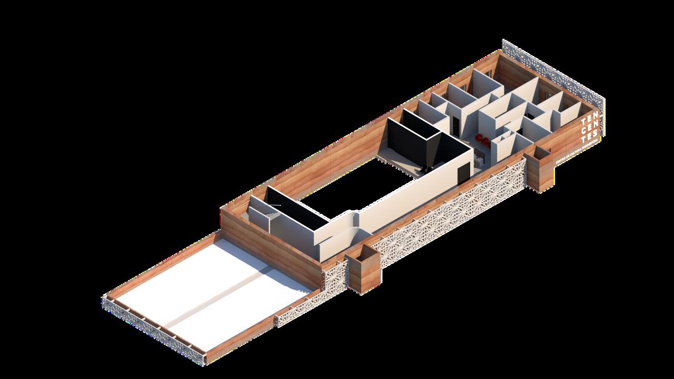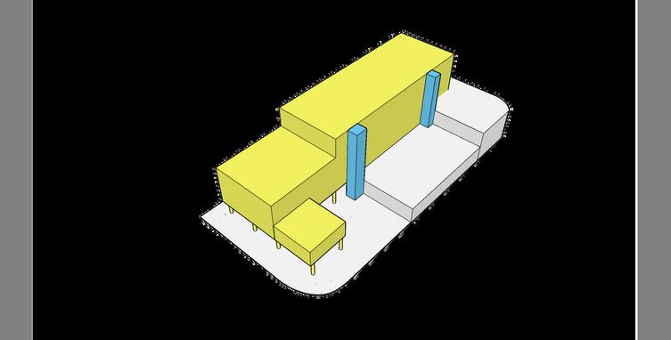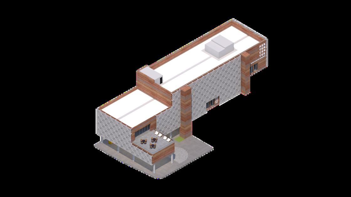 E por último foi adcionada a circulação vertical com os elevadores para fora da edificação. Devido ao grande declive, foi necessário protejar dois elevadores com portas duplas que atendassem todas as áreas do projeto e os platôs do terreno, e trouxessem acessibilidade para todos.