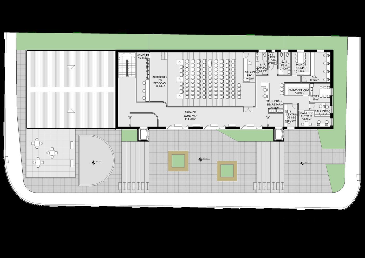 RECEPÇÃO/SECRETARIA 36,95m² ALMOXARIFADO 7,60m² CENTRAL DE SEGURANÇA 8,10m²