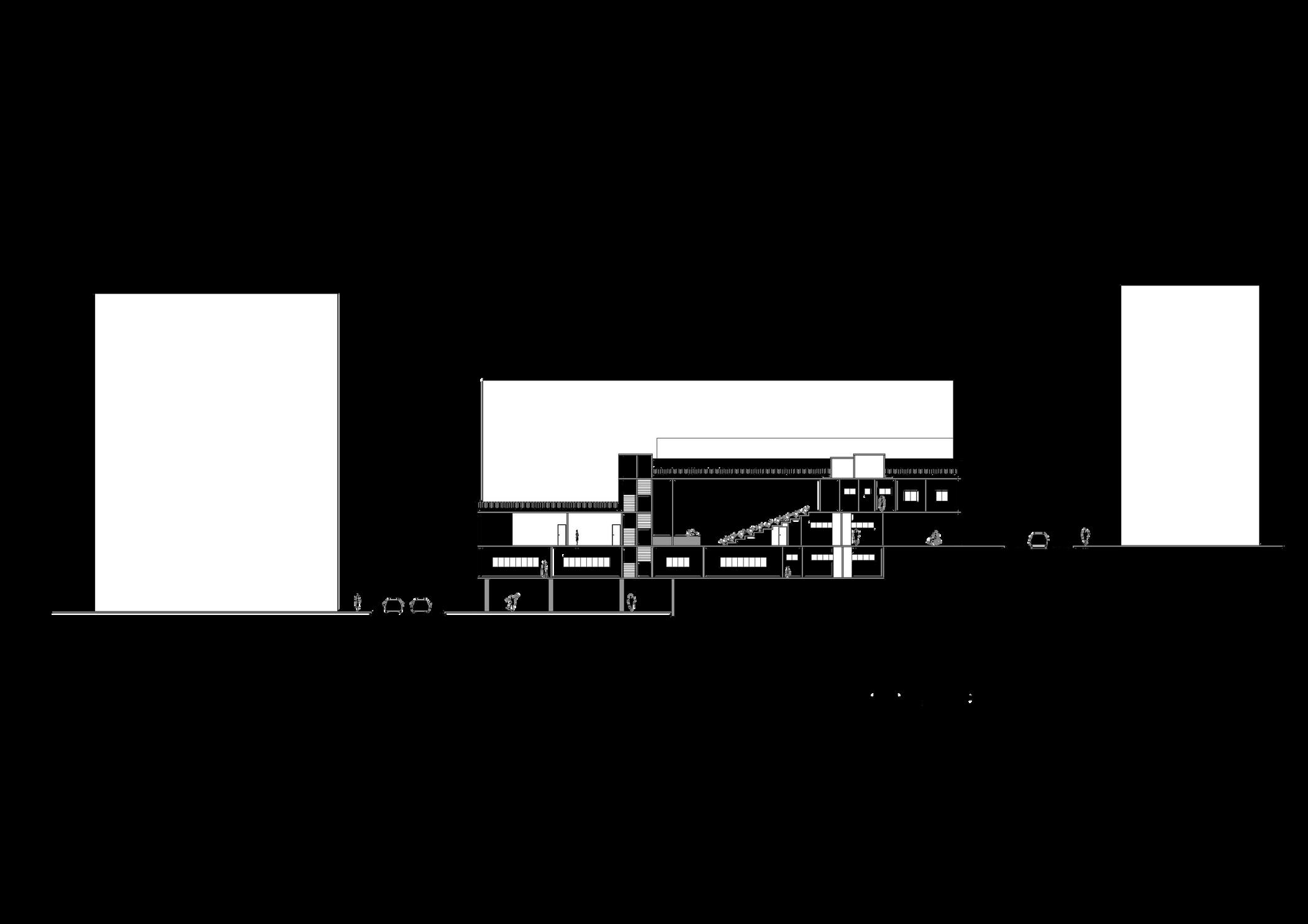 Depois o térreo foi colocado sob pilotis deixando essa área livre e coberta, auxiliando em dias de muito sol e chuva. Também foi projetado um bloco a frente sob pilotis com a função da parede lateral receber a projeção de filmes em telão, já que conta com uma arquibancada a sua frente, protejada na curva de nível do terreno.