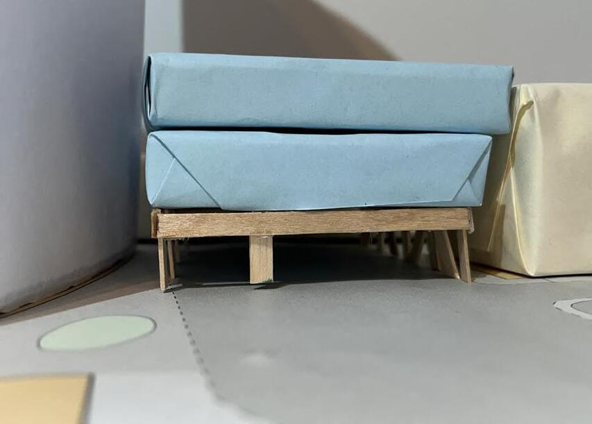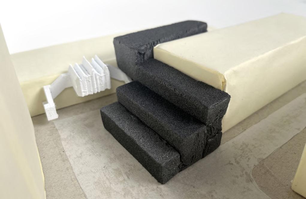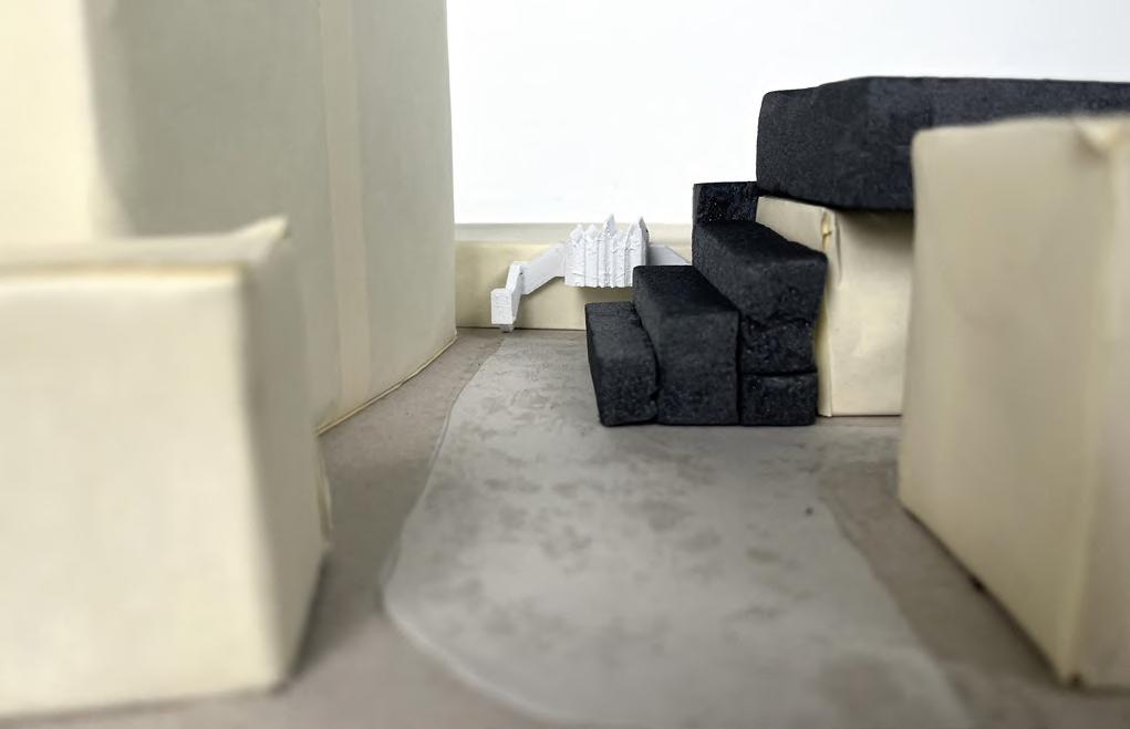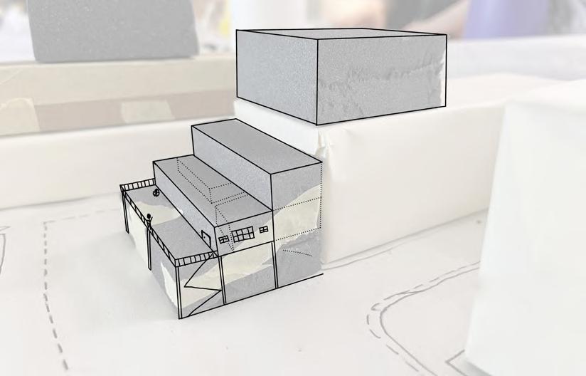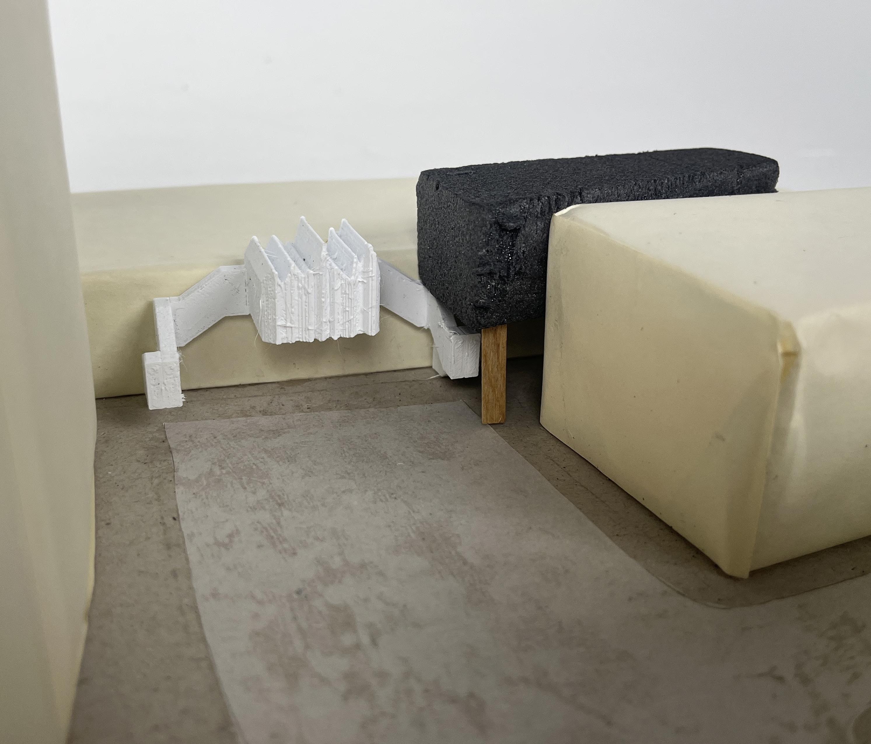 When it was time to begin designing my proposal on the site, I worked primarily in volumes to figure out an arrangement of my building. Because this project is an extension of the “Urban Living Room” I designed, I already knew what physical qualities I wanted it to have in terms of aesthetic and materiality and just needed to work through a layout.