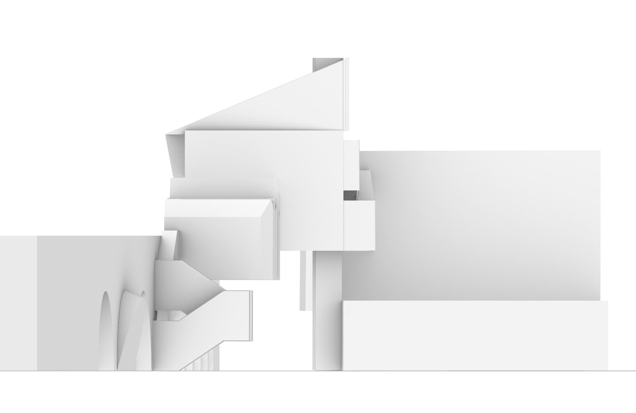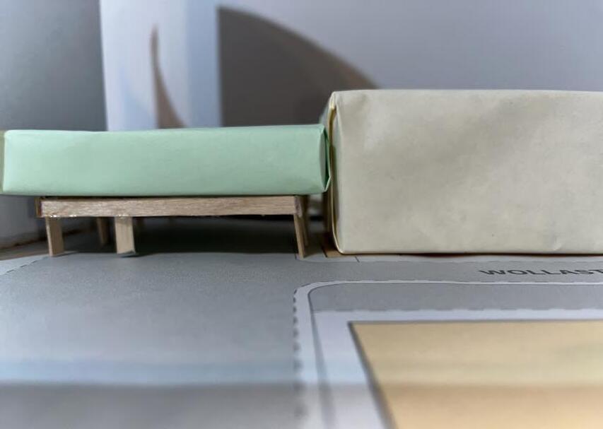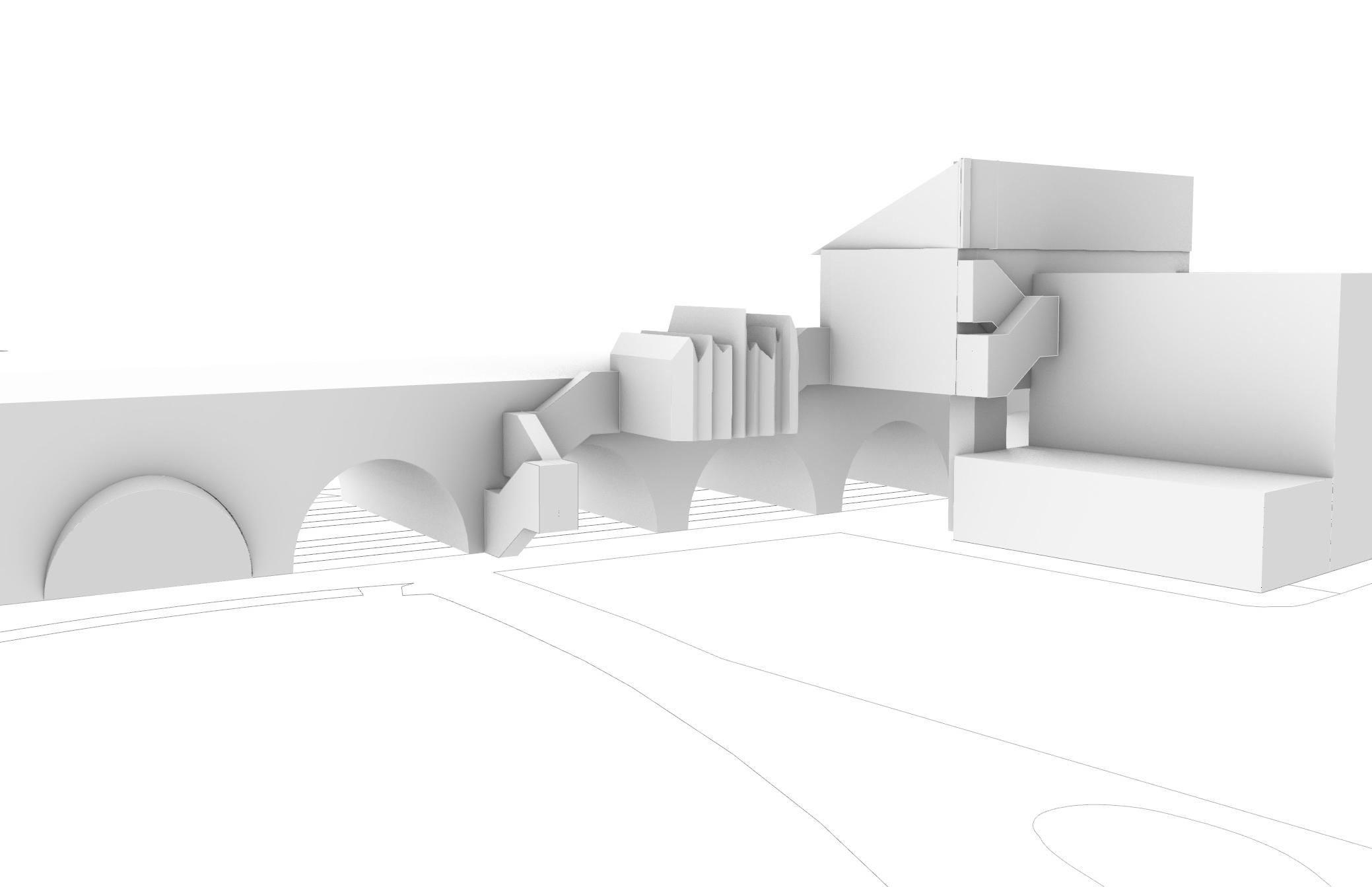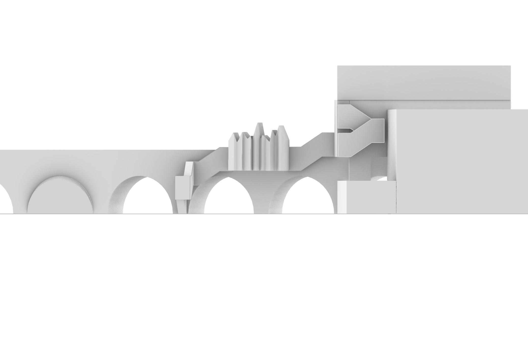 Following the nonsuccess of the previous volumetric studies, I changed my approach. Rather than trying to fit in a large volume to the site and in an attempt to avoid inputing another imposing structure, looked into “filling in the gaps” on site. This gap was filled by this wedge shaped block in the space between the church and the train bridge, but still above the arches as to not block any entrances. I also looked into possibly continuing the expansion on to the top of the church or adding something to the back of the church. I ultimately scrapped the idea of building on the top of the church because I felt it was becoming too invasive. I felt similarly about the back of the church as well in its multi-level form which eventually led to a much simpler bandstand.
