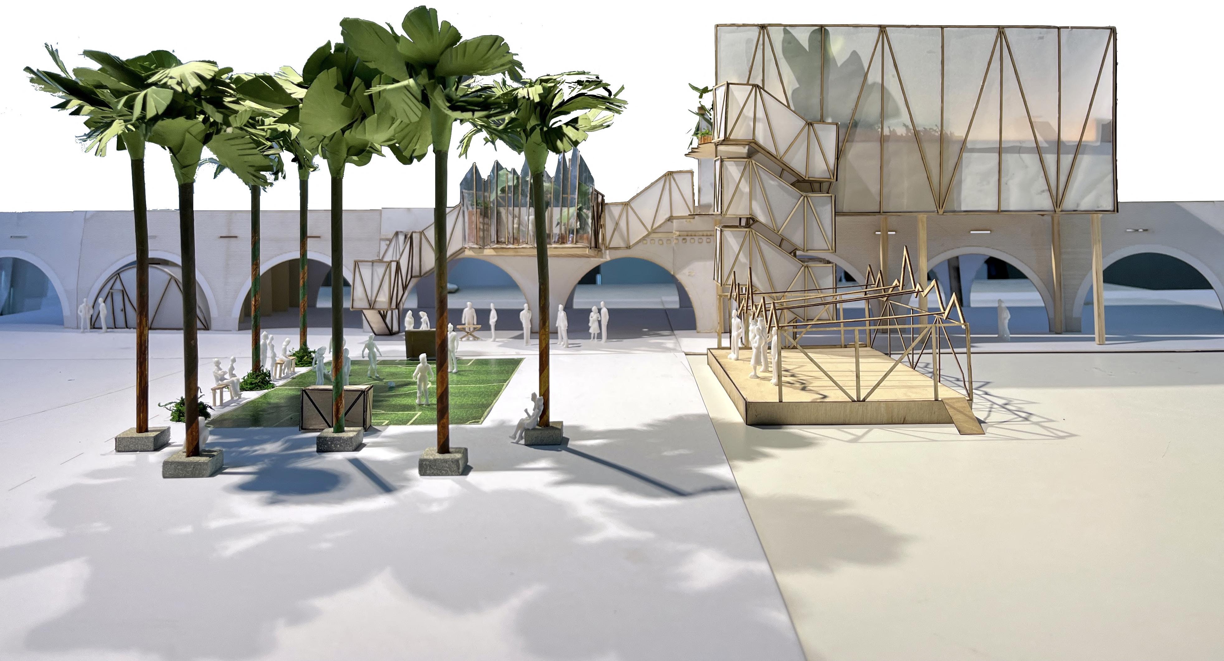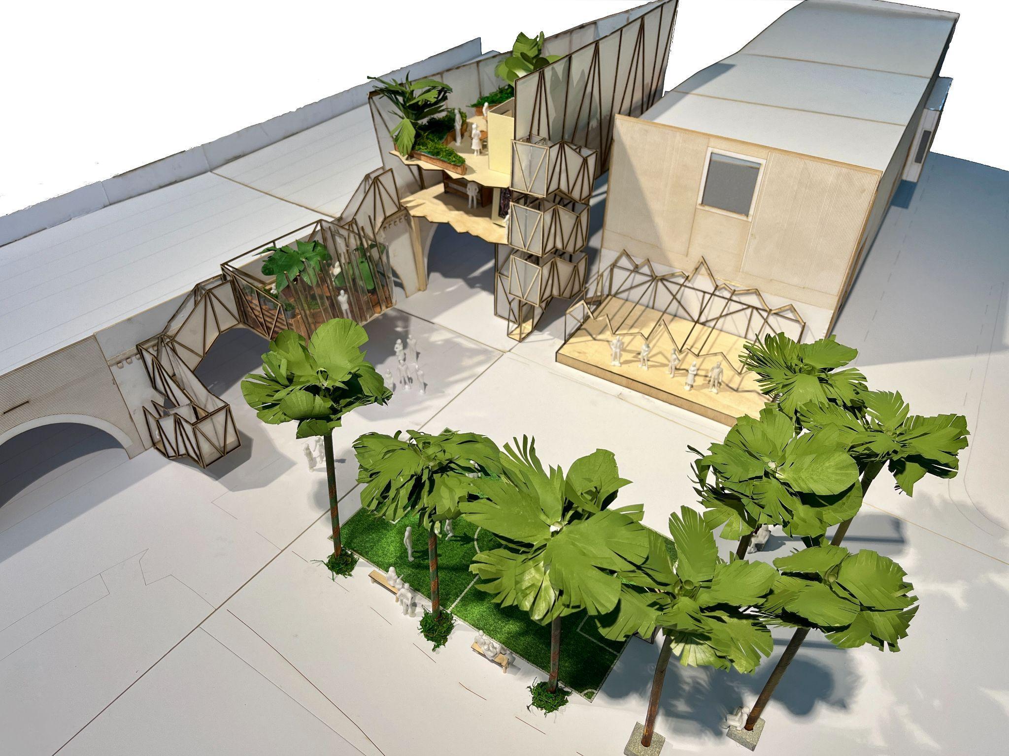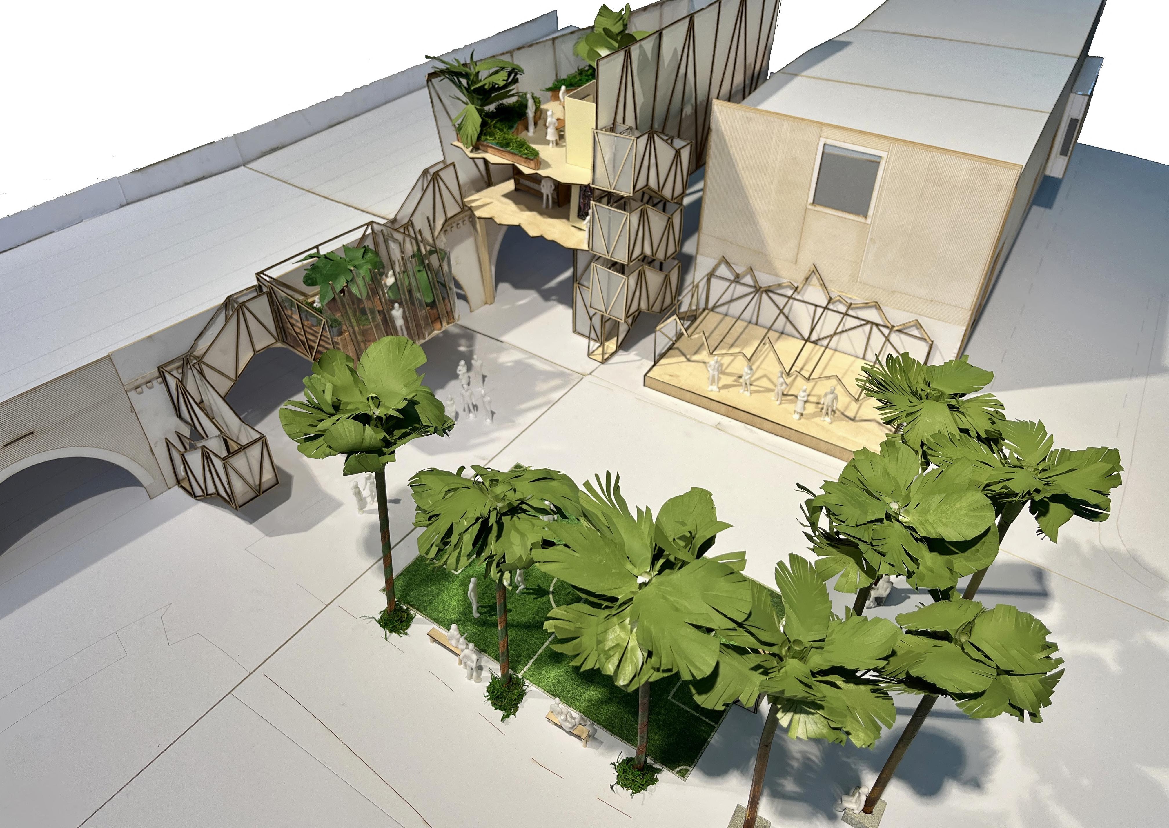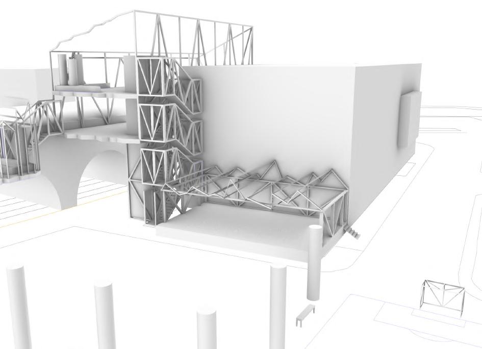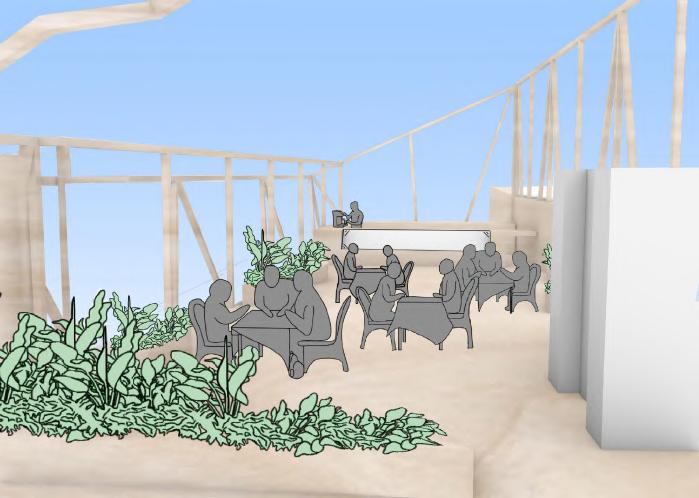 The same materials as the “Urban Living Room” project will be used here to encourage cohesion with the previous design. Additionally, the structure framing will be continued on into the newly added buildings so that the projects all stand as one connected structure in layout and aesthetics.