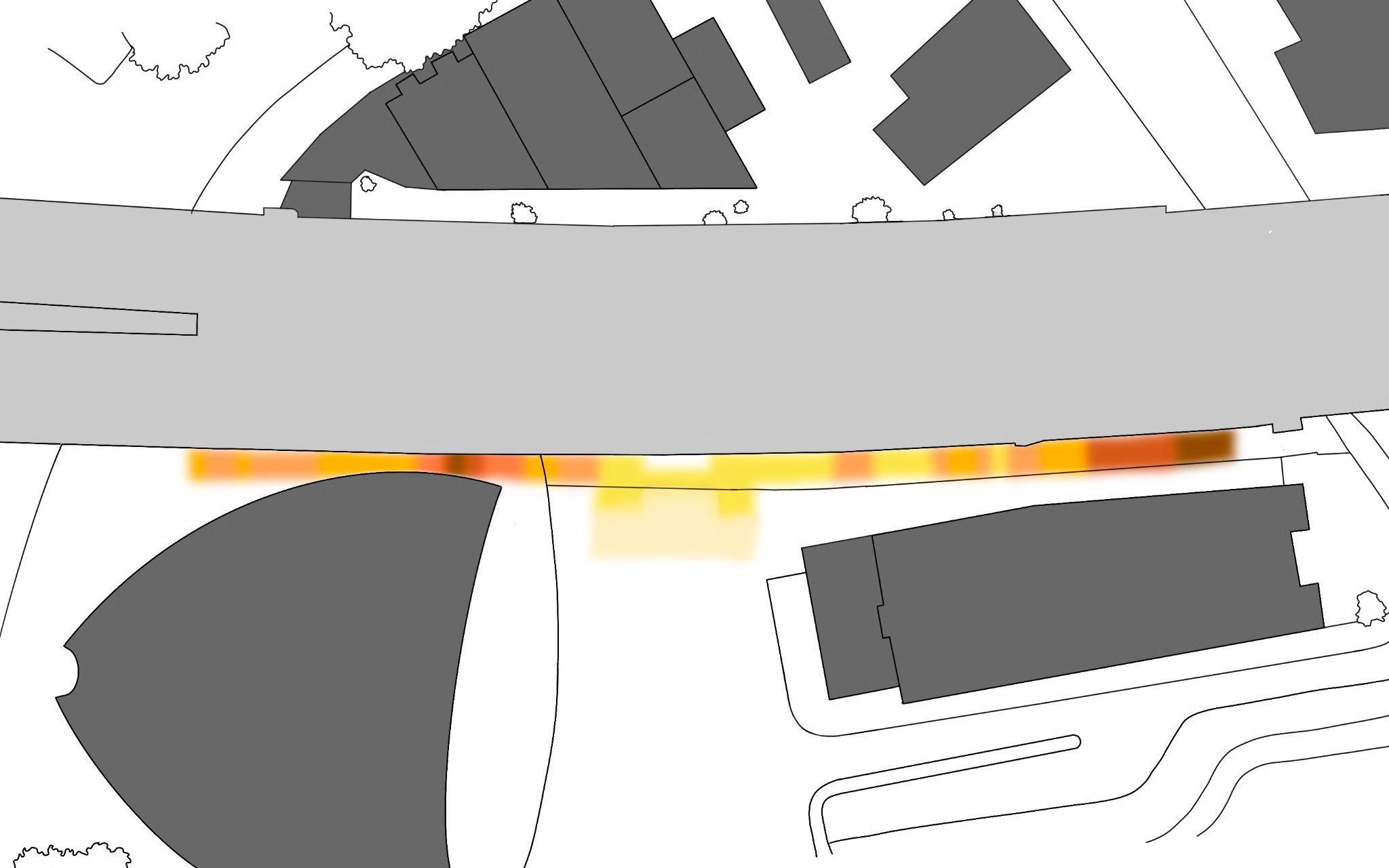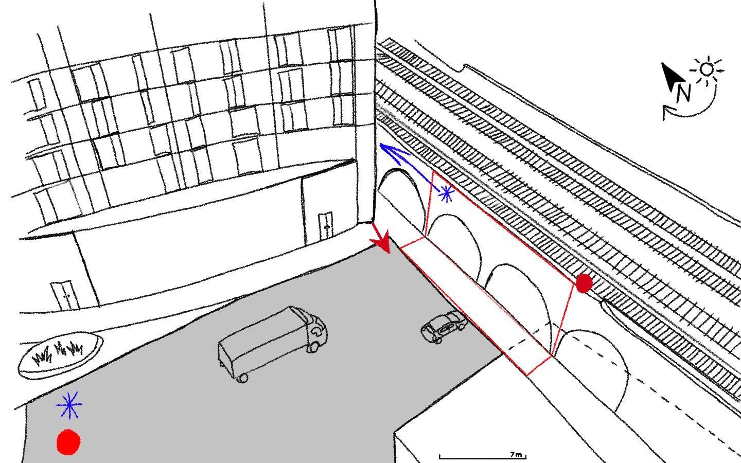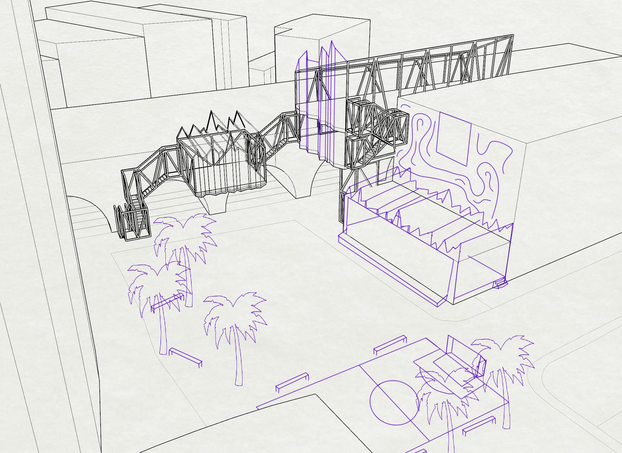 The lot just off Maldonado Way offers great potential for the building, the main difficulty being the arrangement for the room itself. took into consideration the access to sunlight for the existing occupants of this space and would like to attempt to preserve as much of that access as possible. The site for the urban living room is the space above the arches that house Acasifer and Carolina Bar & Lounge which are in Arches 4 and 5 respectively. It is built off of the side of the bridge for support.