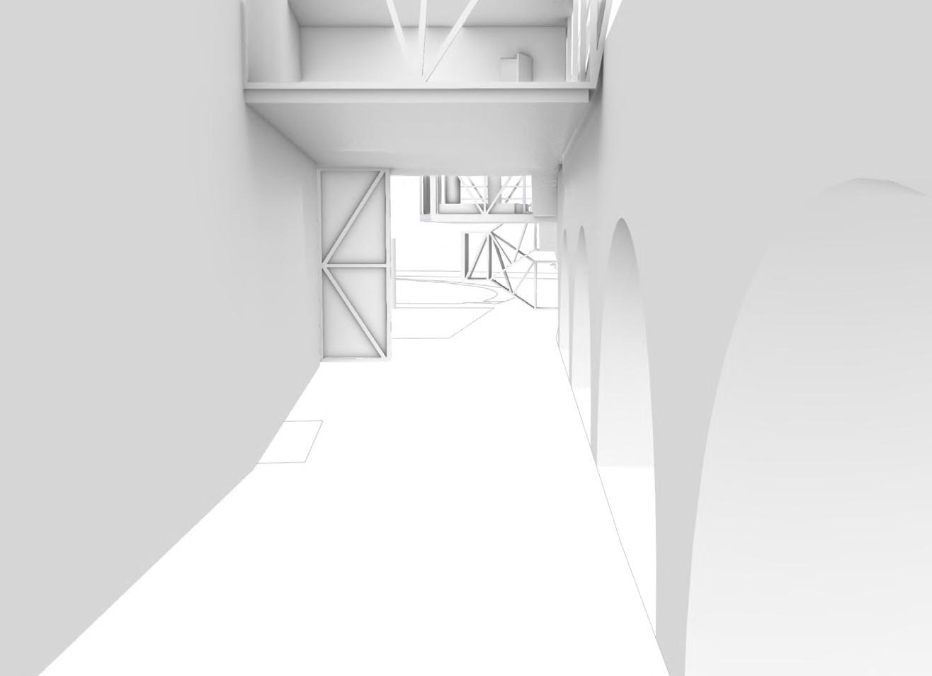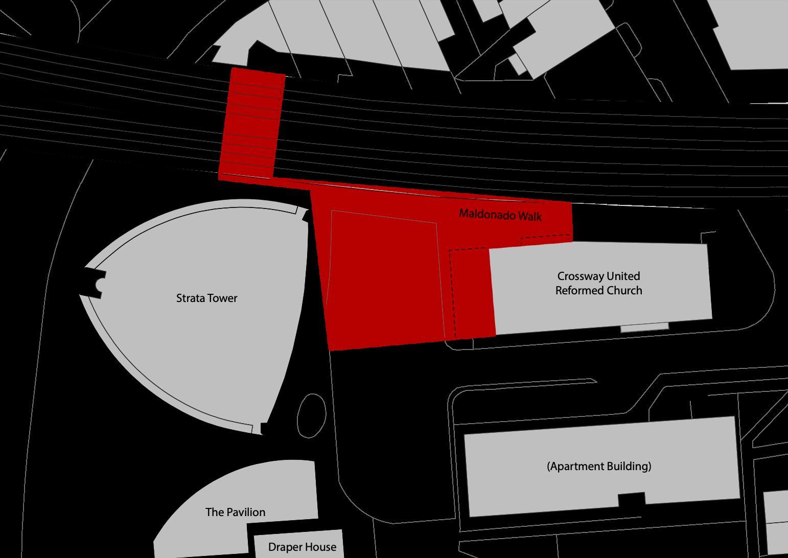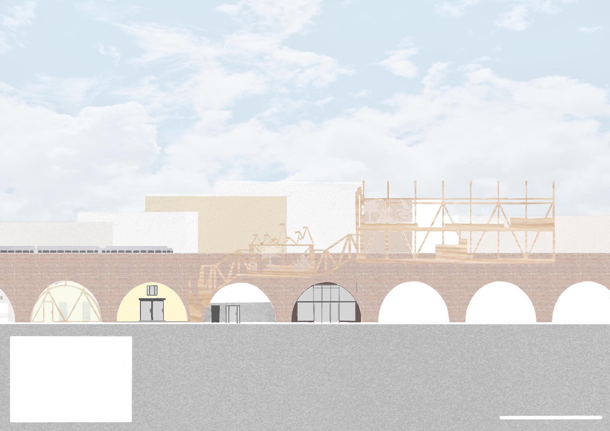 Following this “parasite” idea from the Escuela Pías case study, the proposal is fixed to the brick train bridge and neighboring United Reformed Church, employing the use of existing structures.