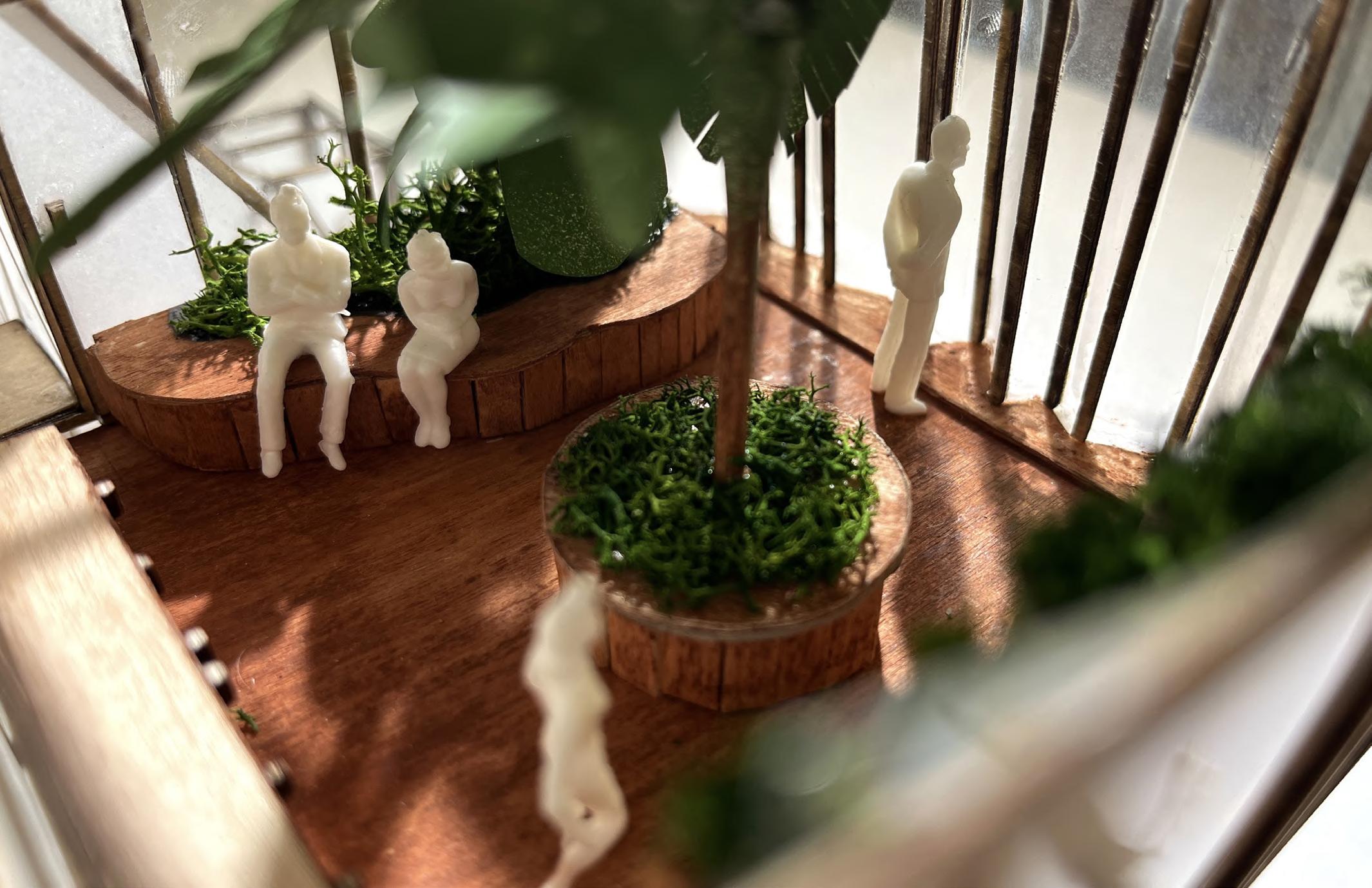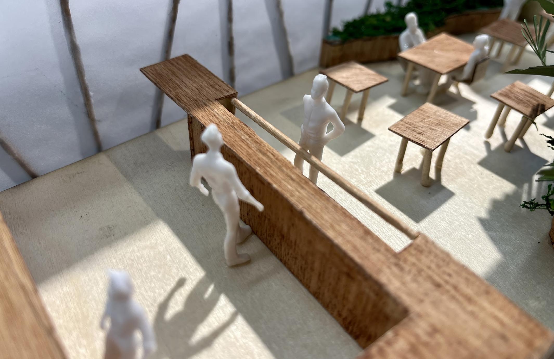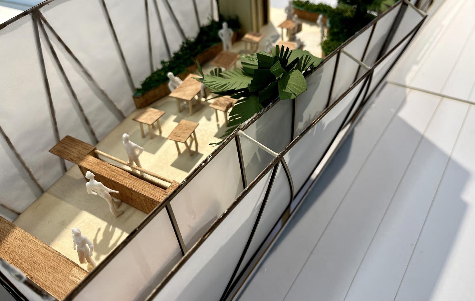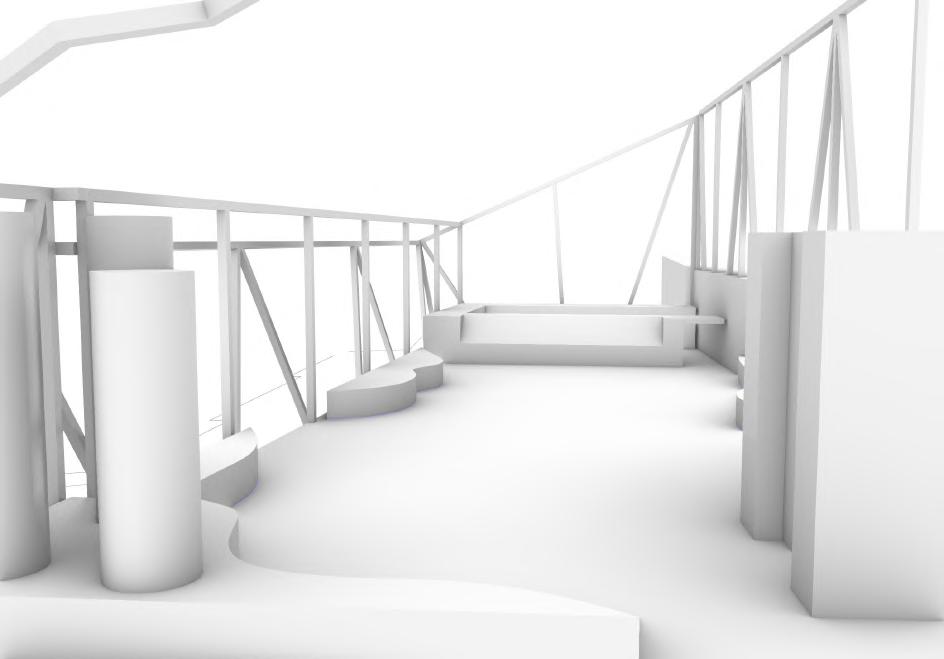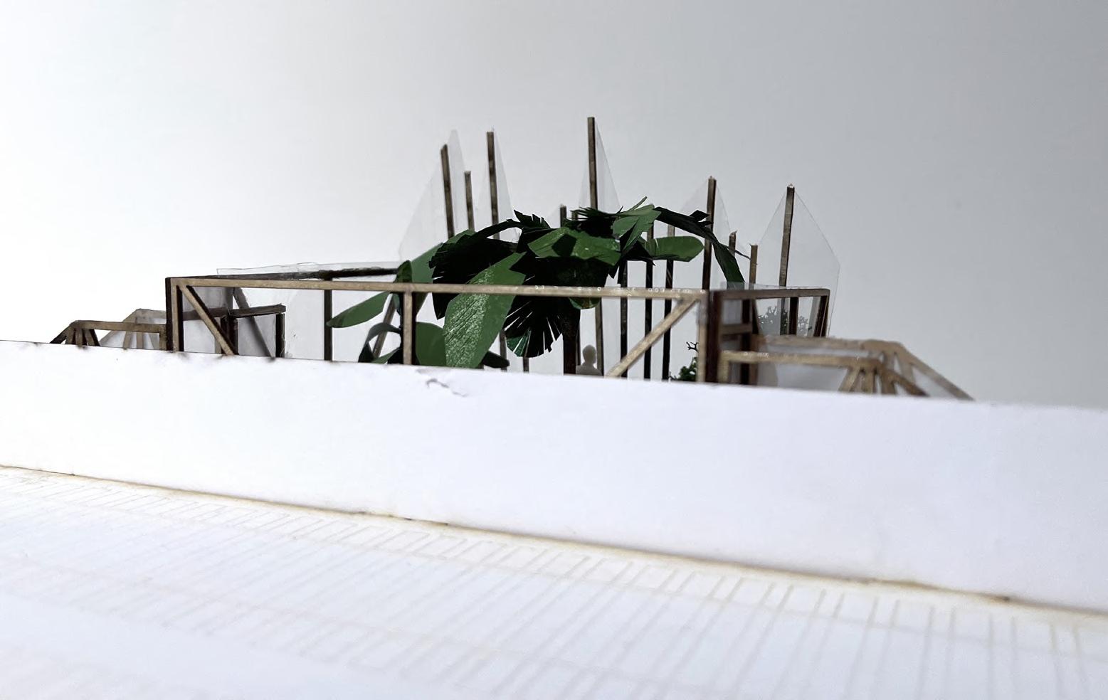 4.) The ceiling height of the building offers the perfect blend of comfort for the occupants while not protruding too much into the sky. It was designed to be a “sneak peek” above the railway to passengers while avoiding becoming another skyscraper. For the sake of visibility, I excluded the roof from the 1:50 model. This volumetric model offers an explanation for the geometry of the roof on the greenhouse.