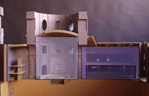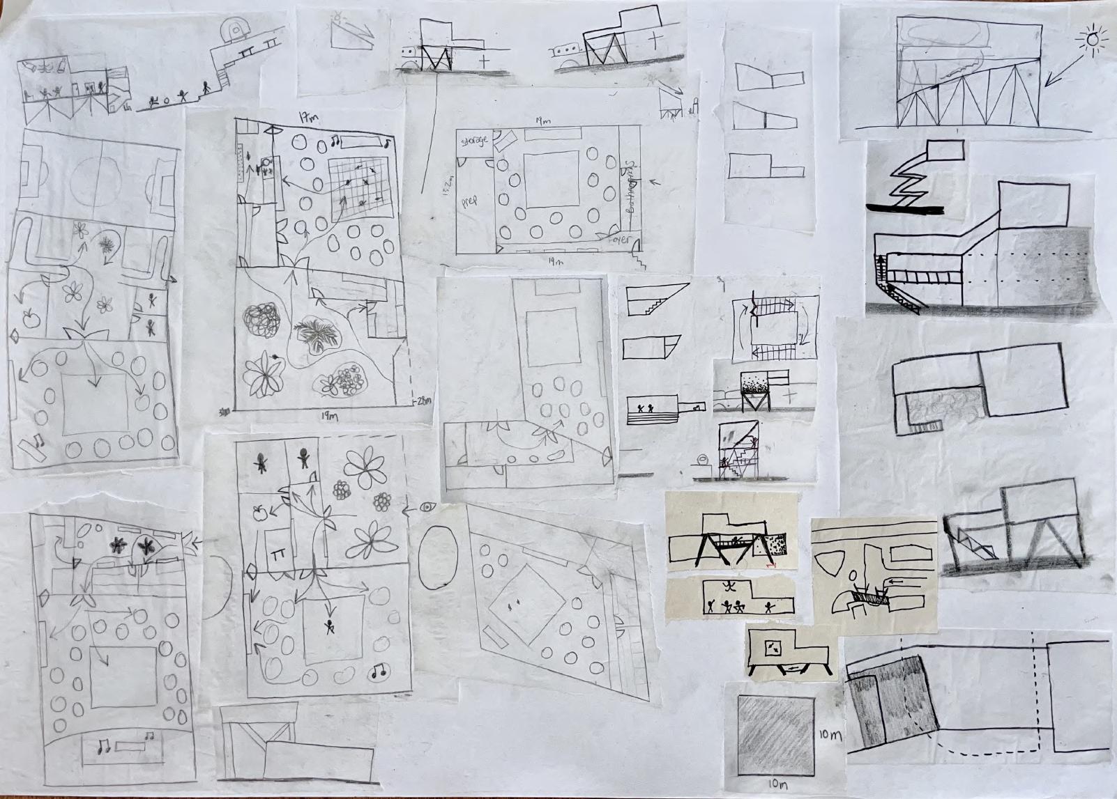 Further ideas of window and facade concepts sketched over volumetric form on top of church and “wedge”