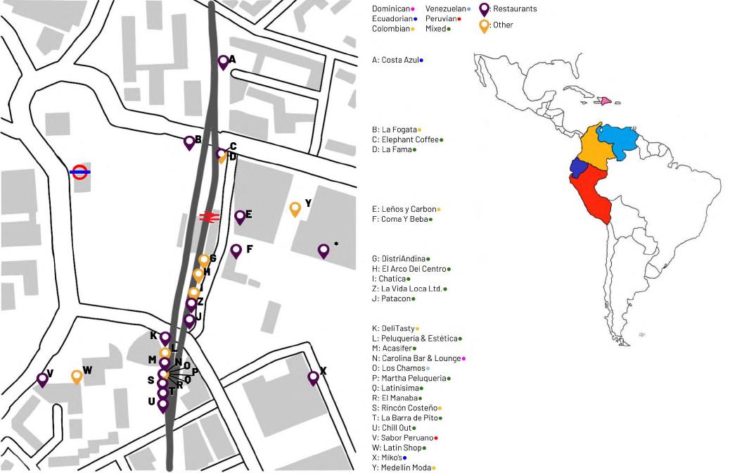 Pinpointing a site was the first step to creating the design proposal which additionally influenced the program. Elephant and Castle has one of the largest population of Latin Americans in London, with several business located just off Walworth Road that represent various countries in Latin America. There is a concentration of businesses specifically along Maldonado Walk where the proposal is located. Maldonado Walk is a small path at the base of the Strata Tower that cuts from Walworth Road to Hampton Street. It was named after Pedro Vicente Maldonado, an Ecuadorian physicist, mathematician, astronomer, topographer, and geographer. This was a very difficult site to design a proposal into because of the surrounding structures however is an excellent location.