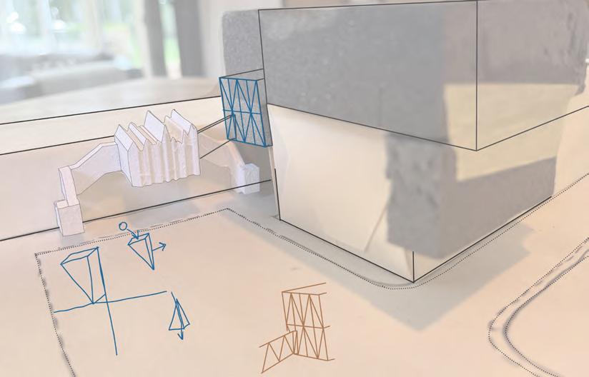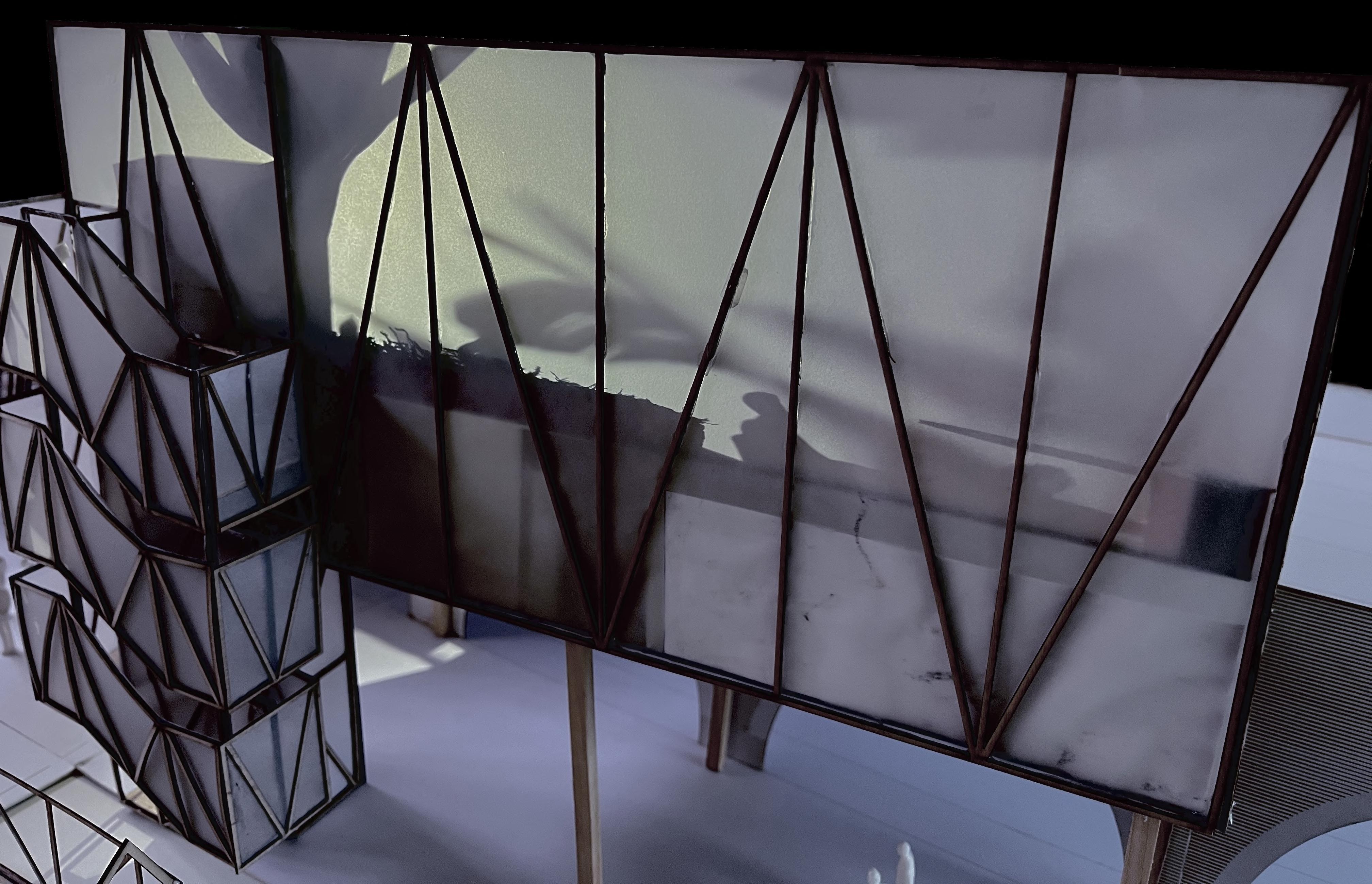 To avoid casting a massive shadow on the space beneath the building like in the initial volume studies, various experiments were conducted to create a functional, and visually interesting window facade/ skylight.