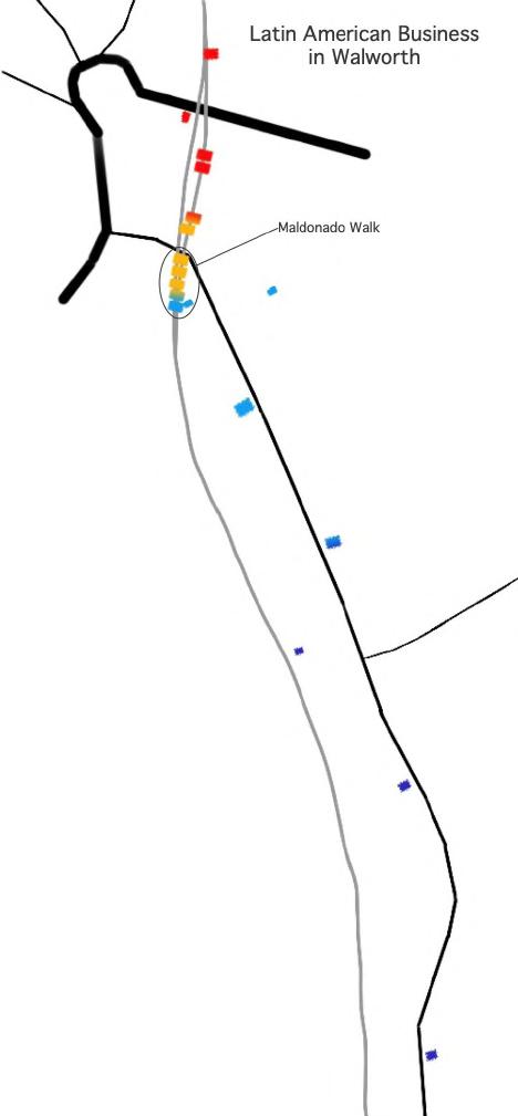 Pinpointing a site was the first step to creating the design proposal which additionally influenced the program. Elephant and Castle has one of the largest population of Latin Americans in London, with several business located just off Walworth Road that represent various countries in Latin America. There is a concentration of businesses specifically along Maldonado Walk where the proposal is located. Maldonado Walk is a small path at the base of the Strata Tower that cuts from Walworth Road to Hampton Street. This was a very difficult site to design a proposal into because of the surrounding structures however is an excellent location.