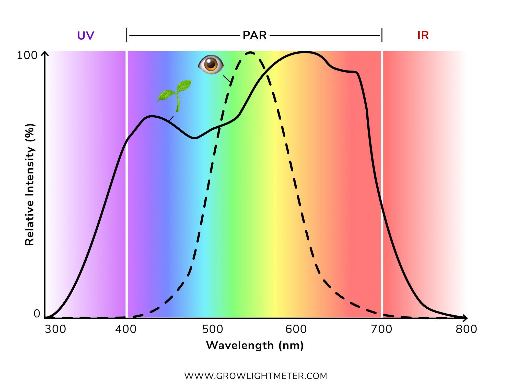 Lux and foot-candle is used to measure intensity of light as seen by the human eye while PAR is used for plants. Light within the PAR spectrum is the useable light a plant needs to photosynthesize. It is widely known that plants need light to grow however the quality of light is also essential to the plants survival. As stated on the Photone - Grow Light Meter website, “optimal plant lighting means that your plants receive the right kind of light (PAR), with the right intensity (PPFD), for the right duration (photoperiod) and the right amount (DLI) of it.”