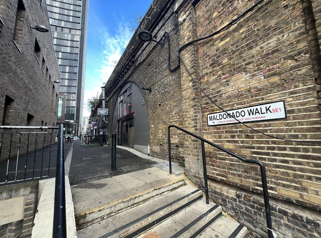 8.) Staircase is fixed to the side of train bridge but is still open to allow those walking along Maldonado Walk to pass through.