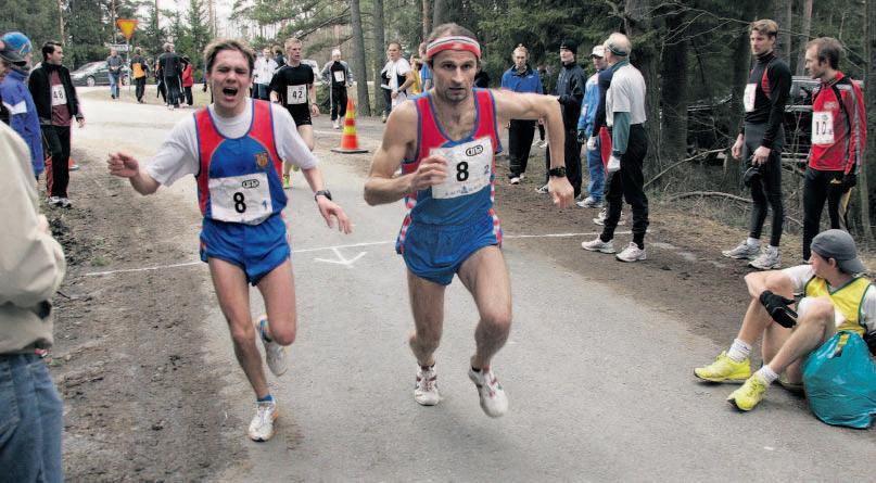Voittajajoukkue Turun Weikkojen Vesa Erojärvi tuo viestin kakkososuudelle lähtevälle Jari Jaakkolalle.