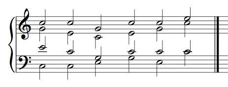 Here is a “rule”: “In a four-voce texture, the third of a tertian chord must always be present but it is acceptable, on occasion, to omit the fifth.” This means that when we have a chord such as a “C E G” the “C” (which we call the chord’s root) must always be present along with the “E” (the chord’s third) but we can omit the “G” (the chord’s fifth).