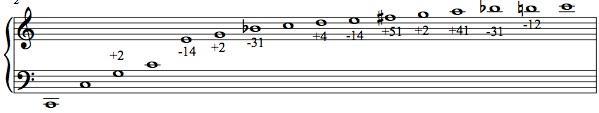Well, almost. The piano we’re playing is equally tempered. The pitches of the overtone series aren’t. Below is that overtone series on “C” again but now the various partials are labeled with plus or minus numbers, the “plus” numbers showing how many cents the particular partial is higher than the equally tempered pitch and the “minus” numbers showing how much lower.