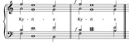 But a text complicates, and enriches, things. Let’s image this same passage but now as a part of a longer “Kyrie” movement (Example VII.14). We can add the text and slightly change the rhythm.