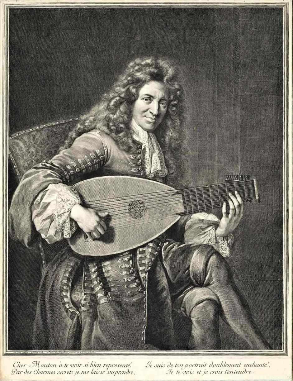French composer and lutenist Charles Mouton (c. 1626-1710) engraved by Gerard Edelinck (1640-1707) after a painting by FrançoisdeTroy(1645-1730) Noticethatthefretsacrossthelute’sneckareclearlyvisible.