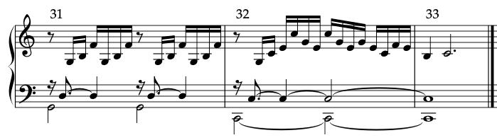 And we have more questions about the prelude’s length. In measure thirty-one Bach has a dominant-seventh, the resolution of the four-three suspension he prepared in the previous