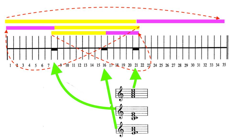 Let’s return to the prelude. We can call the j we just discovered the primary golden ratio of the prelude, going from measure one to the end, measure thirty-five. But measure one to measure twenty-one is another section. If we look at that section, and reverse our direction figuring the golden mean from measure twenty-one to the beginning, we find the golden ratio of that section to be measure eight. That is the prelude’s second j . Now we have a third section,