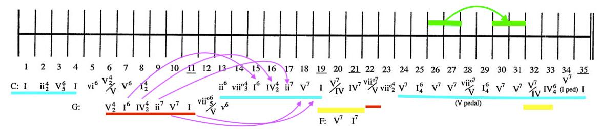 The measures that anchor the five sections are shown in Example 9.11, measures one, eleven, nineteen, twenty-one, and thirty-two; C major, G major, C major, F major (with the seventh added that we’ve already mentioned and will discuss further later) and back to C major.